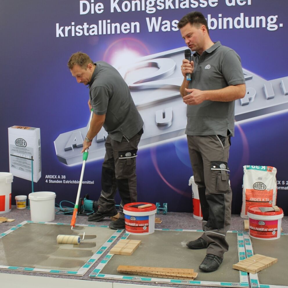 Auch für Estrich- und Bodenleger zeigte ARDEX auf der Messe vielfältige baustellengerechte Angebote. Beispielsweise das 4-Stunden Estrichbindemittel ARDEX A 38. Das Schnellestrich-Bindemittel verfügt über den ARDURAPID-Plus-Effekt und ist zudem extrem schwundarm. Fliesen und Platten im Innen- und Außenbereich können bereits nach 4 Stunden verlegt werden. Auf dem gut besuchten Messestand lieferte ARDEX durch die persönliche Beratung vor Ort den Besuchern für jeden Anwendungsfall die optimale Lösung im System.