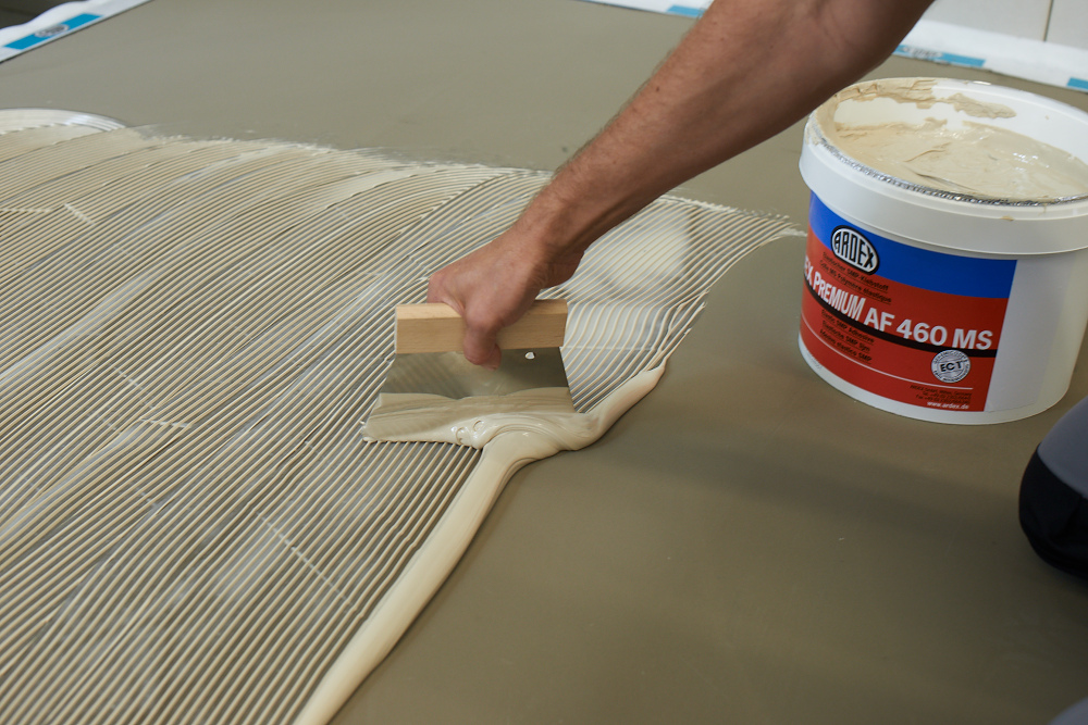 Besonders für Parkettleger interessant war die erste Vorstellung der zwei neuen, sehr emissionsarmen SMP-Parkettklebstoffe. In informativen Produktvorführungen mit modernster Medientechnik wurden diese vorgestellt. Geht es um reine Standardverlegungen empfiehlt sich ARDEX PREMIUM AF 460 MS. Dieser elastische SMP-Klebstoff eignet sich besonders innen zur Verklebung von Hochkantlamellen-, Eiche Stab- und Mehrschichtparkett sowie für ARDEX Trittschalldämm- und Entkopplungsplatten. Ist hingegen mehr Flexibilität und ein breites Anwendungsspektrum gewünscht, ist der neue, festelastische SMP-Parkettklebstoff ARDEX PREMIUM AF 480 MS die richtige Wahl. Er ist besonders geeignet für die Verklebung von anspruchsvollen Holzarten; mit ihm lassen sich fast alle Verlegeanforderungen auf der Baustelle schnell und effizient lösen. Beide neuen SMP-Kleber überzeugen durch ihre sichere, schnelle Verarbeitung und hohe Wirtschaftlichkeit. Nicht weniger wichtig ist ihr sehr emissionsarmer Aufbau nach EC1R-PLUS-Kriterien. In Kombination mit der Schnellspachtelmasse ARDEX K 55 kann die Parkettverlegung so bereits nach 60 Minuten beginnen. Und sollte im Bodenaufbau eine Feuchtigkeitssperre oder Grundierung erforderlich sein, ergänzt die neue 1K-PU Grundierung ARDEX PU 30 perfekt das System. Die Grundierung eignet sich hervorragend als direkter Voranstrich unter ARDEX Reaktionsklebstoffen wie den SMP-Klebstoffen. Denn oft können Staubablagerungen auch durch den Einsatz eines Saugers nur bedingt entfernt werden. Neben den neuen Systemprodukten wurde zum 01.07. auch der neue lösemittelfreie Kontaktklebstoff eingeführt. Vor allem in besonders anspruchsvollen Bereichen, wie bei der Belagsverklebung auf Treppenstufen und –kanten zeigt sich die besondere Stärke des ARDEX PREMIUM AF 620.