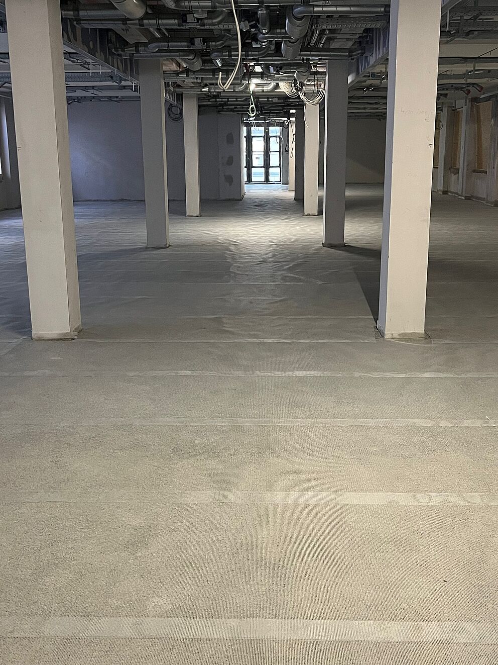Nach zwei Wochen war es so weit: Der Untergrund war vorbereitet, und die Bodenleger der Fußbodenmanufaktur Schwarz konnten mit dem Aufbau des Ardex-Systembodens beginnen. Sie teilten dafür zunächst jede Etage in zwei Abschnitte mit jeweils rund 500 Quadratmetern ein. Dann ging es Abschnitt für Abschnitt und Etage für Etage voran – mit klaren Wochenplänen: Am Montag und Dienstag legten die Handwerker zunächst die Baufolie einlagig auf dem Untergrund aus. Dann trugen sie als erste Systemkomponente die Leichtschüttung ARDEX LS auf. „In der Regel beginnend in einer Höhe von 20 mm, aber der Boden war so uneben, dass in manchen Bereichen Aufbauhöhen von 60 mm erforderlich waren“, sagt Ardex-Teamleiter Thomas Hausding.
