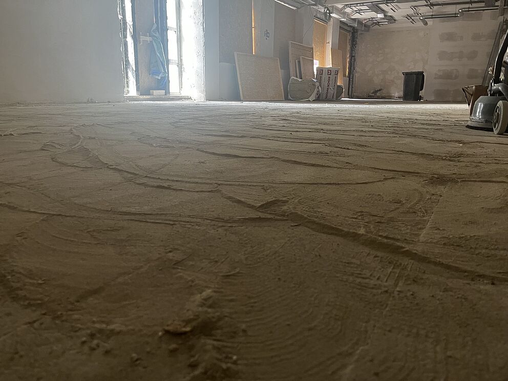 Mitte 2023 fiel dann der Startschuss für die Arbeiten am Fußboden. Für das zehnköpfige Team der Fußbodenmanufaktur Schwarz aus Berlin hieß das: Es musste zunächst den Untergrund teilweise rückbauen. Dieser bestand aus verschiedenen Altuntergründen wie Gussasphaltestrich, Steinholzböden oder Fliesen. Zum Teil war der Untergrund mit Zementmörtel oder anderen Ausgleichsmassen überspachtelt. „Der Boden war sehr uneben, und wir haben erst einmal alles abgefräst. Manchmal haben wir richtige Gipsberge abgetragen, die in die vorhandenen Hohlraumböden eingesickert waren“, erinnert sich Geschäftsführer Wolfgang Schwarz.