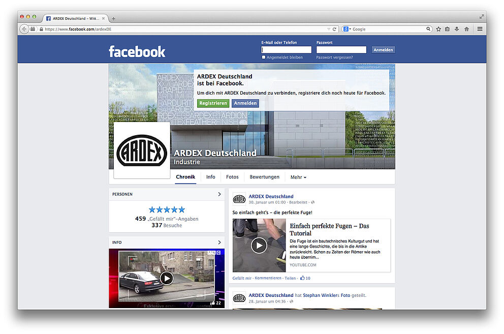 Social Media als Domäne großer Konsumgüterhersteller und zahlloser Freaks? Der Baustoffhersteller Ardex zeigt, dass es auch anders geht. Das Familienunternehmen aus Witten hat schon gute Erfahrungen mit einem eigenen YouTube-Kanal und mehreren Apps als Bestandteil der Marketing-Kommunikation gemacht. Seit November ist es mit einer eigenen Unternehmensseite auf Facebook aktiv. Hier informiert Ardex unter anderem über Produktneuheiten, Veranstaltungen und Gewinnspiele. Zudem erhalten Kunden und Interessenten die Möglichkeit, hinter die Kulissen des Qualitätsanbieters zu blicken.