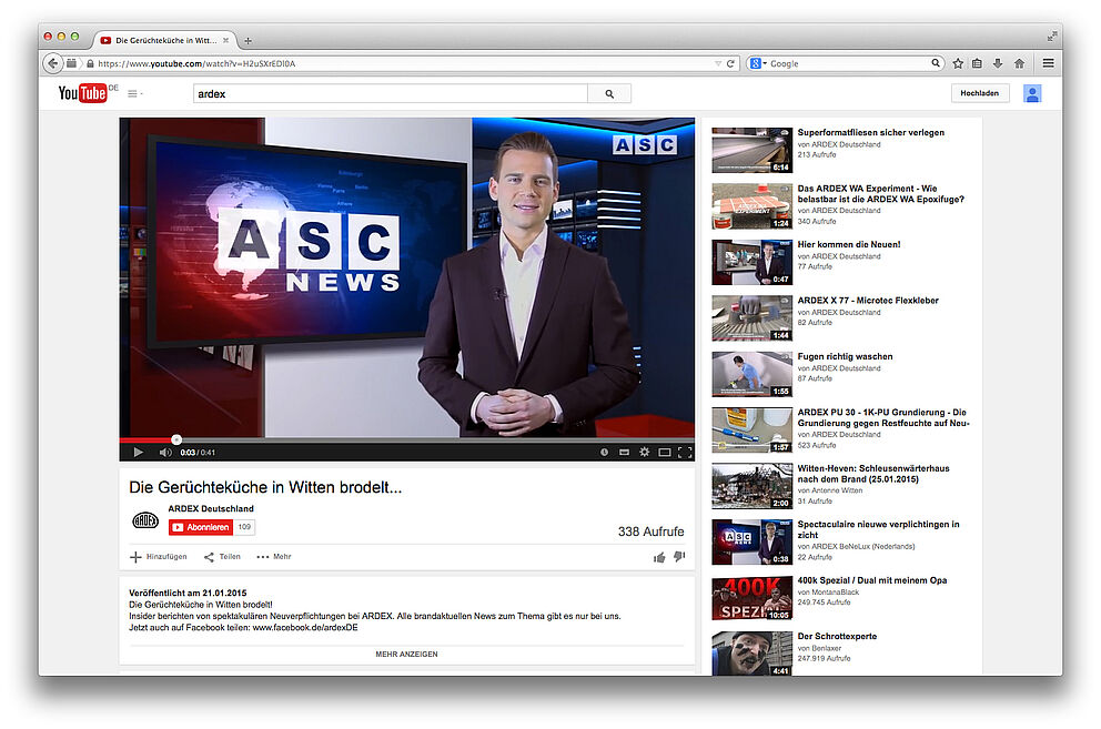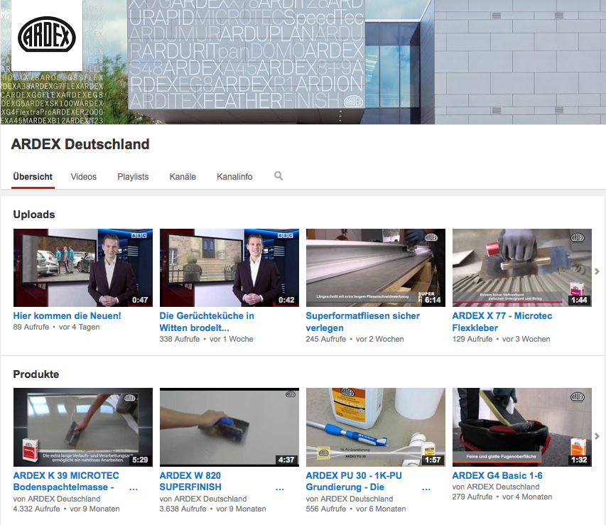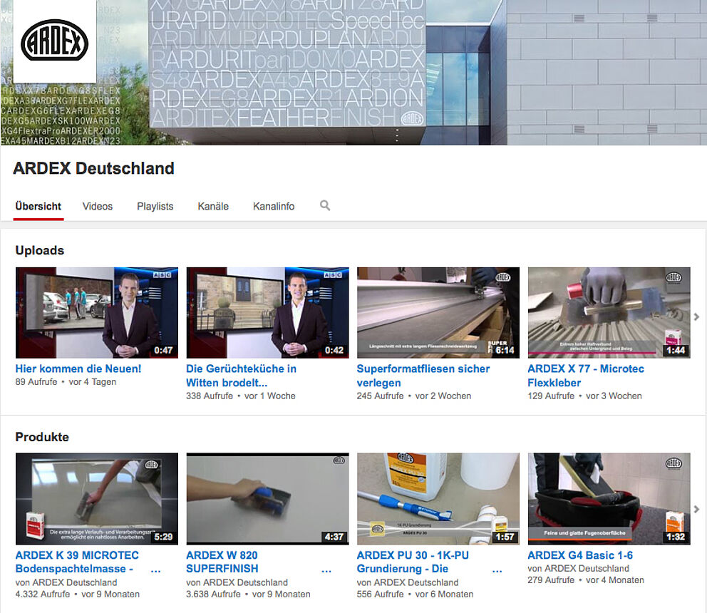 Seit Januar hat Ardex auf YouTube bereits über 20 neue Produktclips, Tutorials und Extras zu Spezialthemen veröffentlicht. „Die digitale Kommunikation hat Eingang in die Arbeitswirklichkeit auf Baustellen und in die Beratung gefunden. Das können und wollen wir nicht ausblenden“, begründet Marco Schröder die Social Media-Aktivitäten des Unternehmens. „Die Verarbeitungseigenschaften und Besonderheiten der Ardex-Produkte lassen sich sehr gut über Bilder transportieren. Auf Facebook und YouTube können sich unsere Kunden mit uns vernetzen, in den Dialog treten und auf unterhaltsame Weise informieren“, so Schröder.
