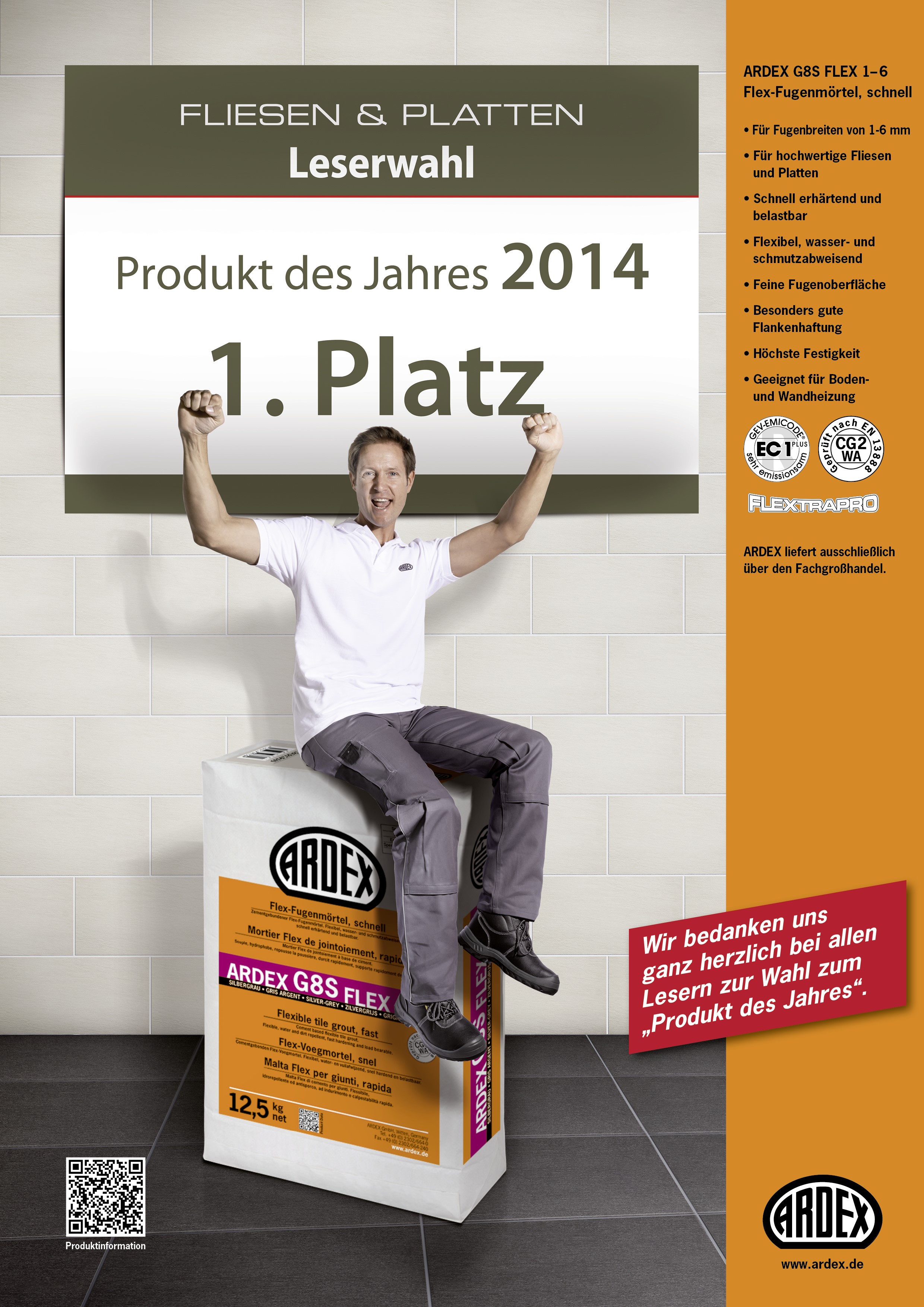 „Unser herzlicher Dank geht an die Leser der FLIESEN & PLATTEN, die uns erneut mit dem 1. Platz ausgezeichnet haben.“, kommentiert Dr. Ulrich Dahlhoff, Geschäftsführer Marketing und Vertrieb, das Abstimmungsergebnis. „Wir freuen uns ganz besonders, dass wir mit einer unserer 2014 neu eingeführten Fugen überzeugt haben. Und bedanken uns an dieser Stelle auch bei unseren Kunden, die uns bei der größten Produktumstellung in der Ardex-Geschichte unterstützt und die Einführung so erfolgreich gemacht haben.“