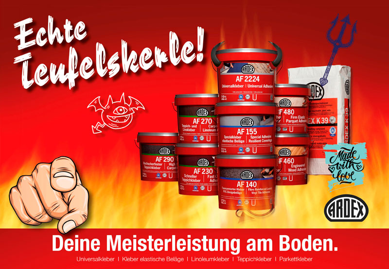 Bei den Verpackungen hat sich Ardex ebenfalls am Praxisbedarf orientiert. So können die Anwender jetzt anhand der aufgedruckten Bilder auf einen Blick erkennen, für welchen Einsatzbereich das Produkt ist – ebenso am Produktnamen. Hinzu kommt neben den auffällig roten Eimern eine spezielle Farbcodierung auf jedem Produkt. „Braun steht beispielsweise für Parkettprodukte und grün kennzeichnet den Anwendungsbereich für textile Beläge“, so Kupka weiter. Zusätzlich gibt es sogenannte Basisprodukte, die universell einsetzbar sind. Sie sind mit grau gekennzeichnet. Dazu kommt ein aufmerksamkeitsstarker neuer Marketingauftritt.