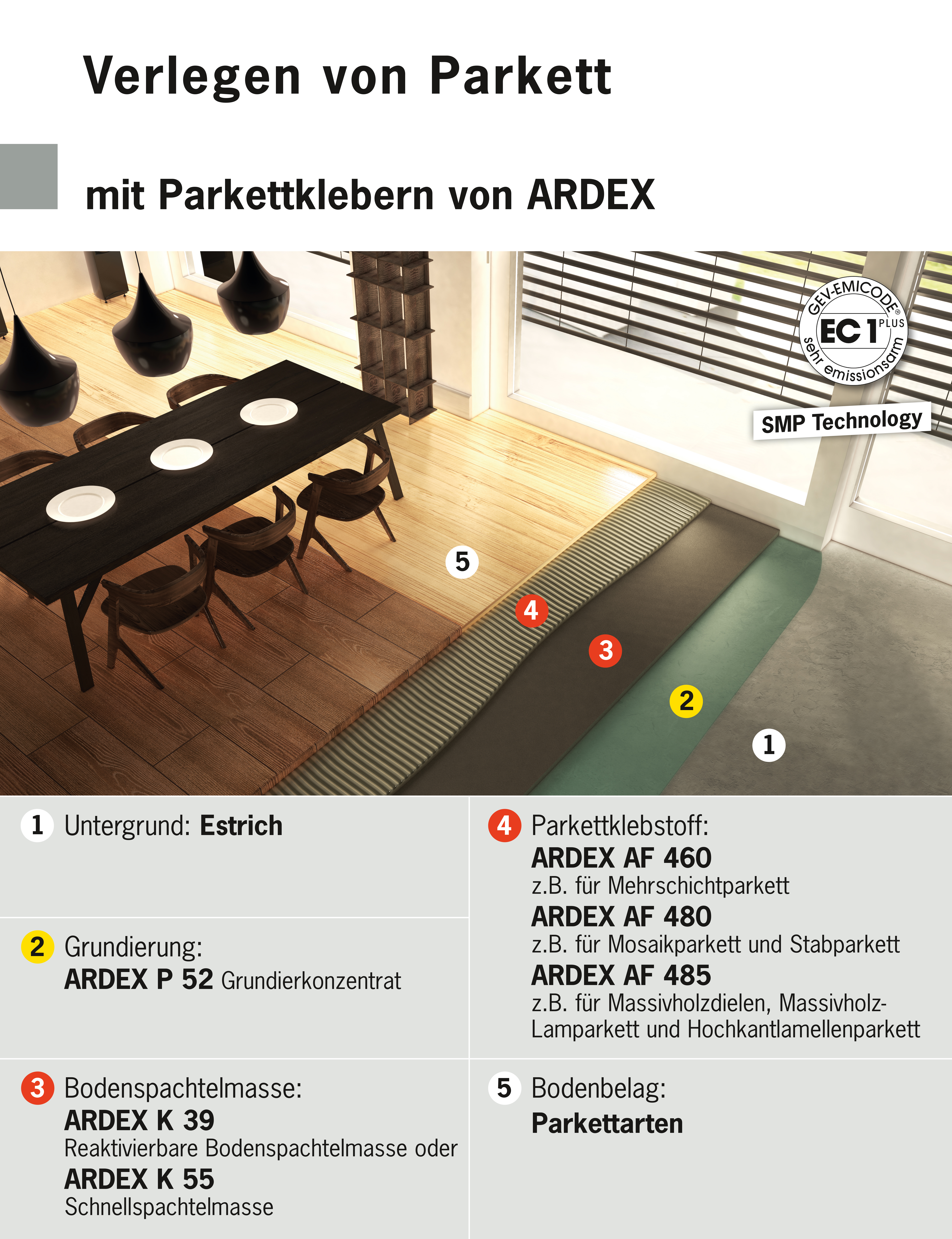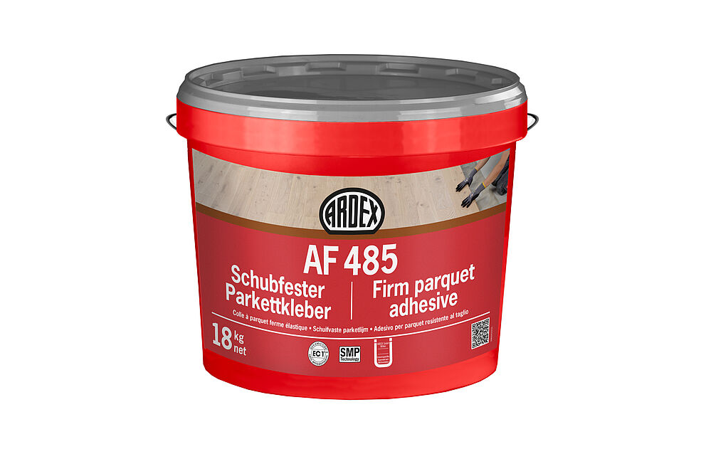 Der schubfeste Parkettkleber auf SMP-Basis ist sofort gebrauchsfertig. „Hier verbinden sich die Klebeeigenschaften eines klassischen 2K-Parkettklebers mit den Vorteilen eines 1K-Produktes“, so Martin Kupka. „Und was gut zum Ardex-Nachhaltigkeitskonzept passt: Reste von ARDEX AF 485 brauchen nicht entsorgt, sondern können auf der nächsten Baustelle wieder eingesetzt werden.“ Wie alle Ardex-SMP-Parkettklebstoffe hat auch ARDEX AF 485 eine sehr lange Lagerdauer: Ungeöffnet können Handwerker das Originalgebinde mindestens 18 Monate lang lagern.