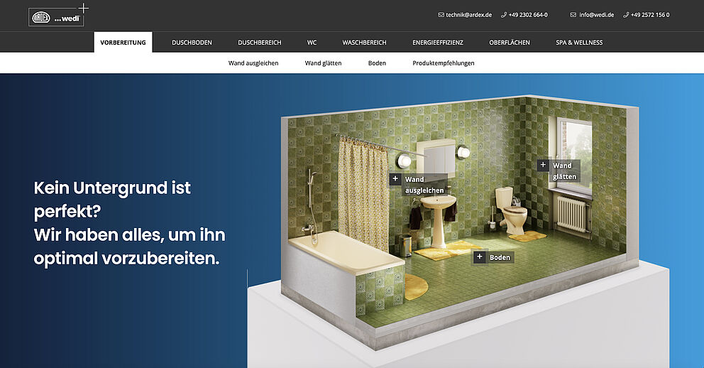 Dementsprechend ist die Ardex-wedi-Website modular aufgebaut – und gibt konkrete Antworten. Wie geht es weiter, wenn die alten Fliesen und die Sanitärobjekte weg sind? Was mache ich, wenn an den Wänden Steine ausgebrochen oder noch Kleberreste vorhanden sind? Jeder Arbeitsschritt von der Untergrundvorbereitung über den Duschbereich bis hin zu den Oberflächen wird genau beschrieben und mit den passenden Produkten verknüpft. „Die Profis können entweder die einzelnen Schritte nacheinander durchgehen oder sich einzelne Punkte herausgreifen – je nach Bedarf“, erklärt Markus Stolper.