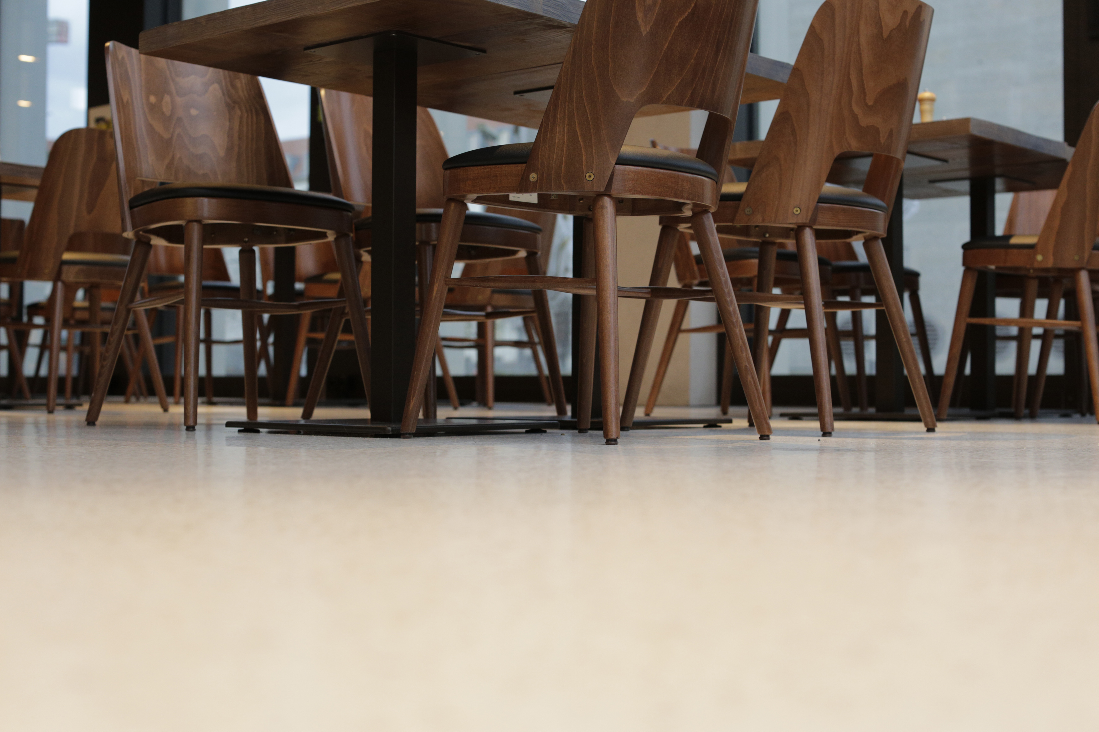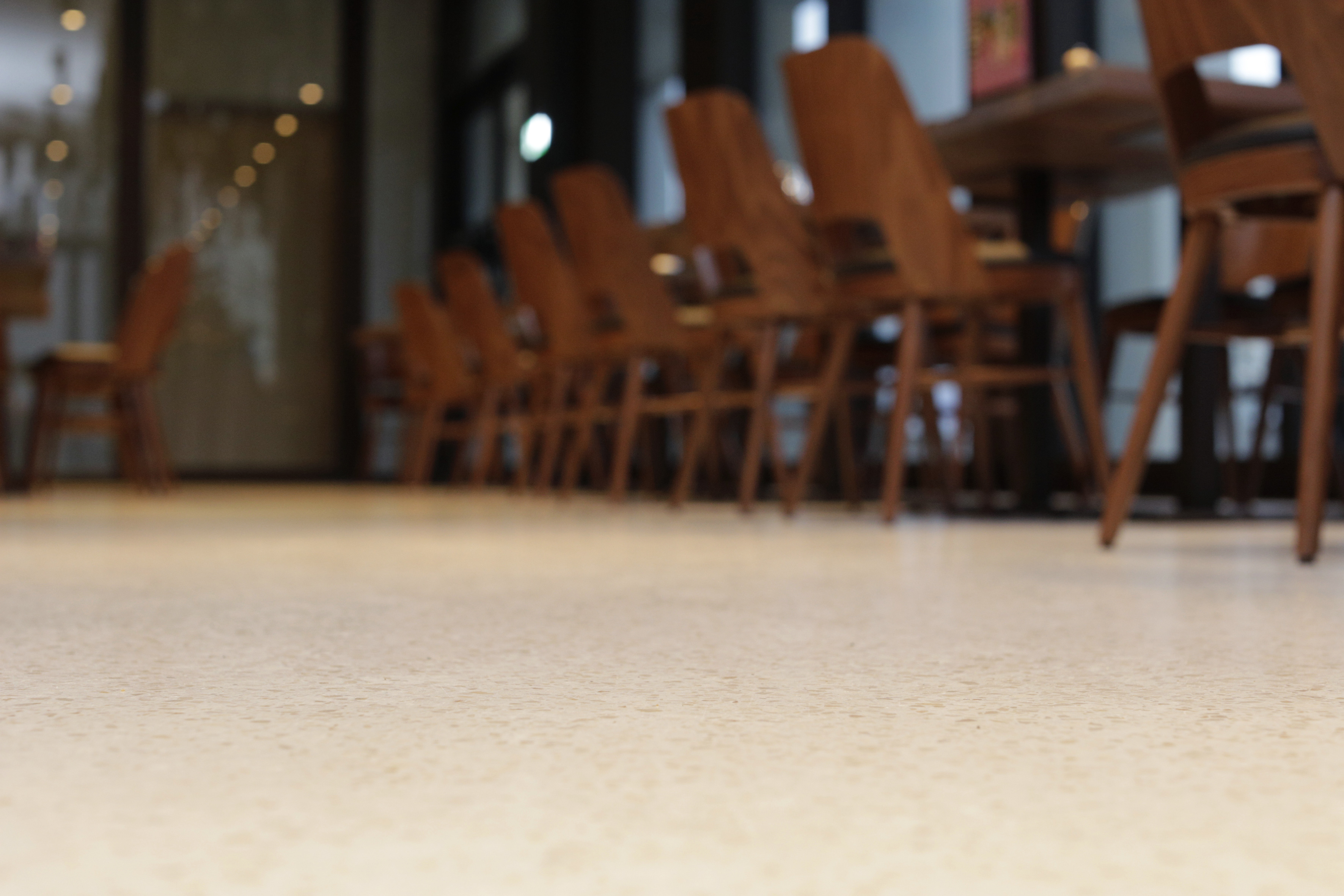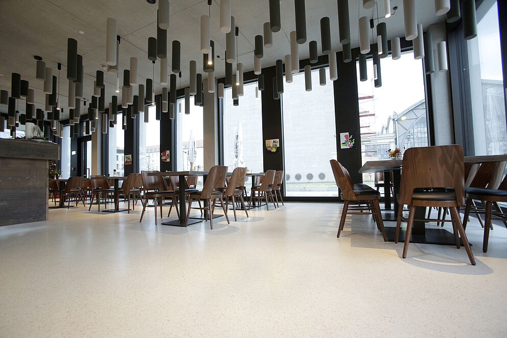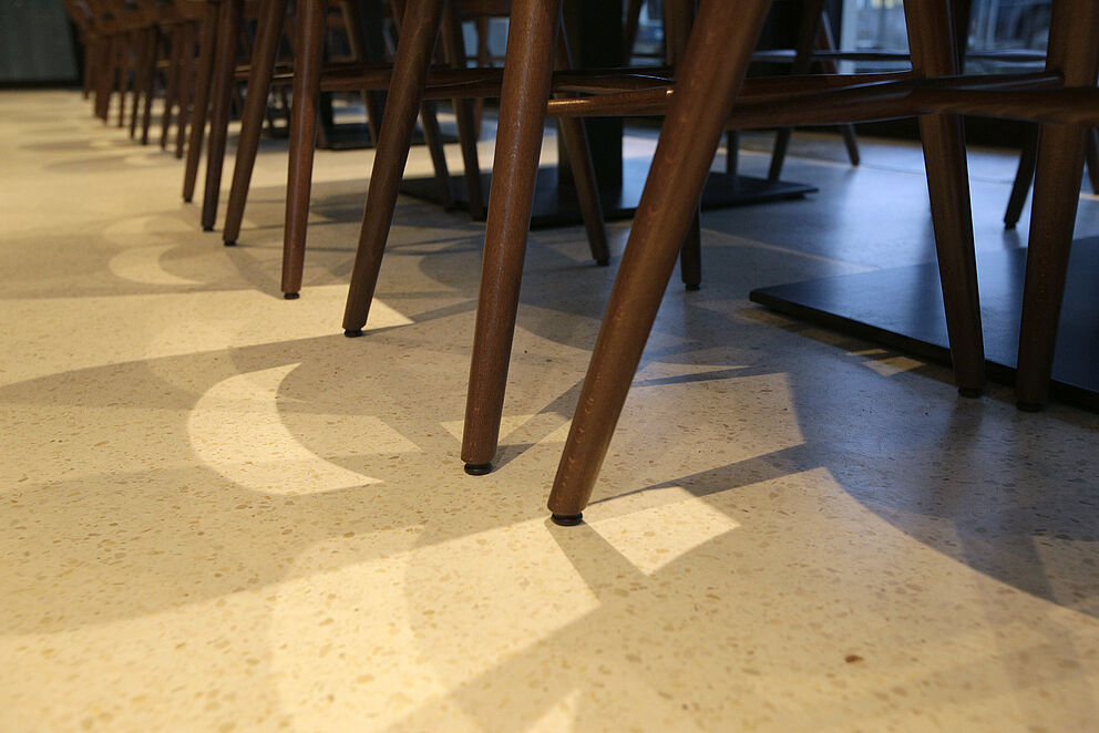 Die Bodenoberfläche in dem Restaurant wurde mit dem ARDEX PANDOMO TerrazzoBasic gestaltet. Die Nutzung in einem gastronomischen Betrieb verlangt einen Boden, der eine bestimmte Härte und Rutschfestigkeit mitbringt, starker Beanspruchung standhält und pflegeleicht ist. Gefragt war in dem modernen, offenen Ambiente zudem ein Belag, der eine großzügige Oberflächengestaltung ermöglichte. Die Wahl des Bodens fiel Reinhard Bär leicht, da PANDOMO TerrazzoBasic auch im Atrium des Geschäftshauses verlegt wurde. „Der Bauherr und Eigentümer des Gebäudes ließ mir die Wahl, mich im Restaurant für einen anderen Boden zu entscheiden“, berichtet der Restaurantinhaber. Da er das Atrium ebenfalls nutzen kann, etwa für Großveranstaltungen am Wochenende, war es sinnvoll, im Restaurant den gleichen Boden zu verlegen. „Und die Anmutung des Bodens fand ich sehr gut und passend“, so Bär weiter.