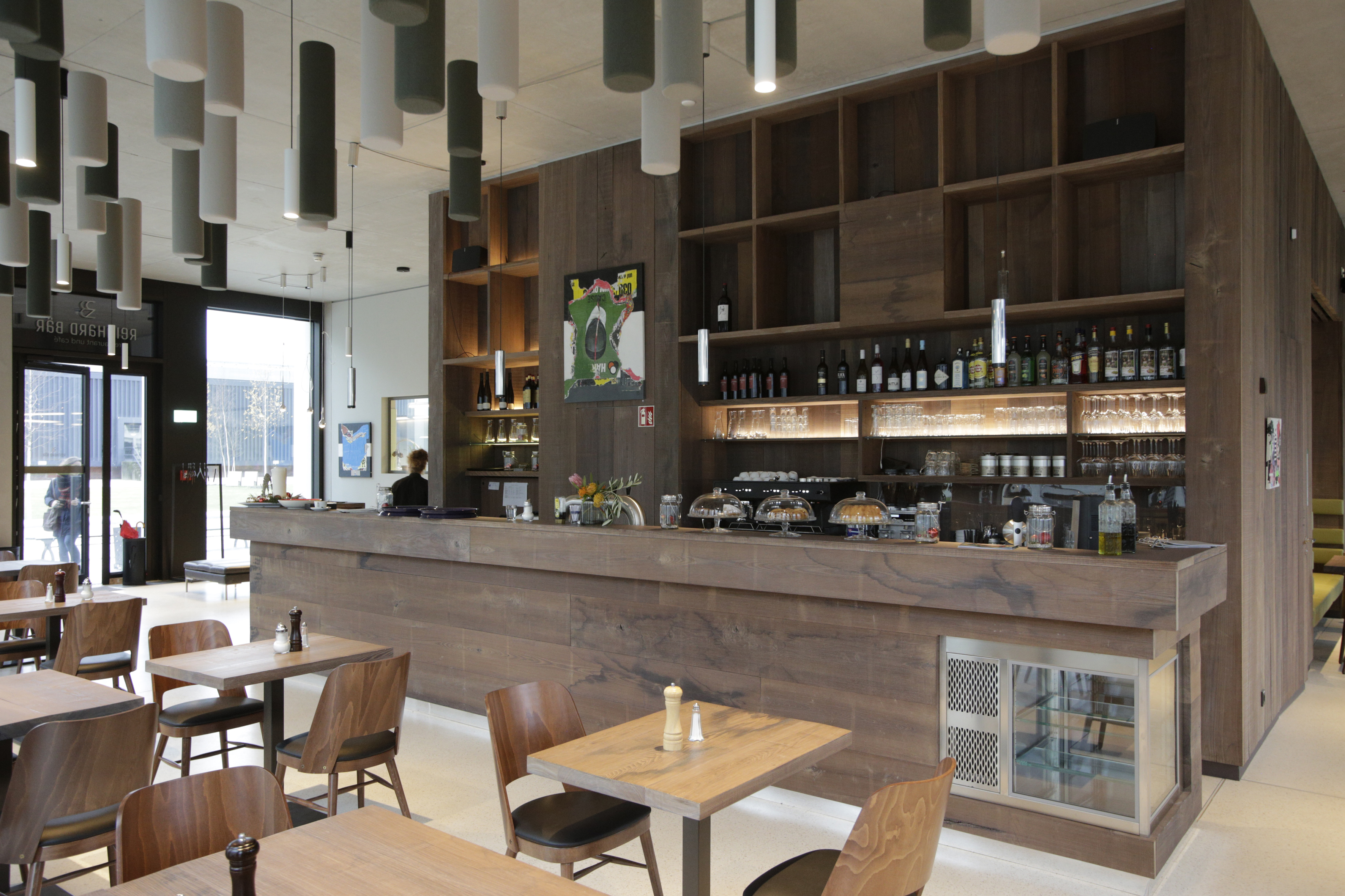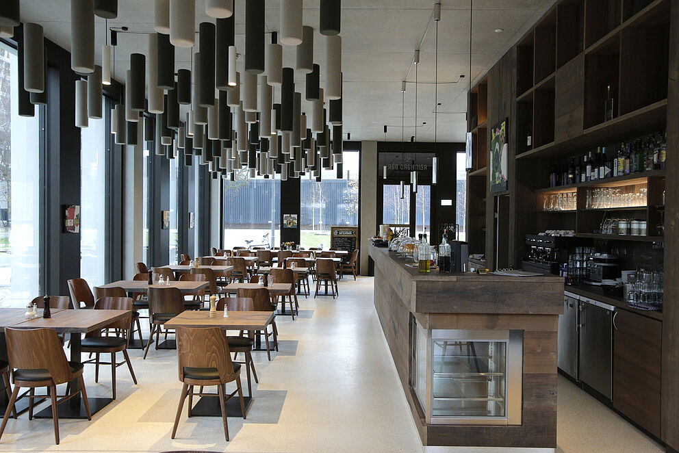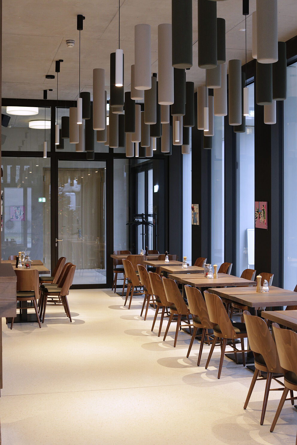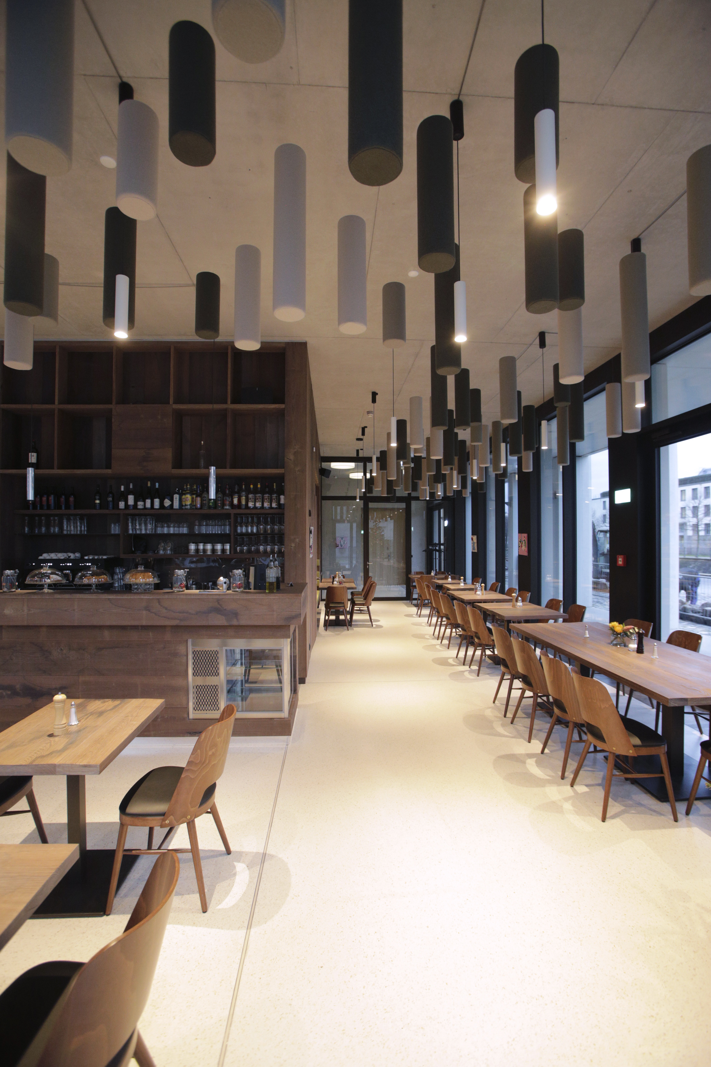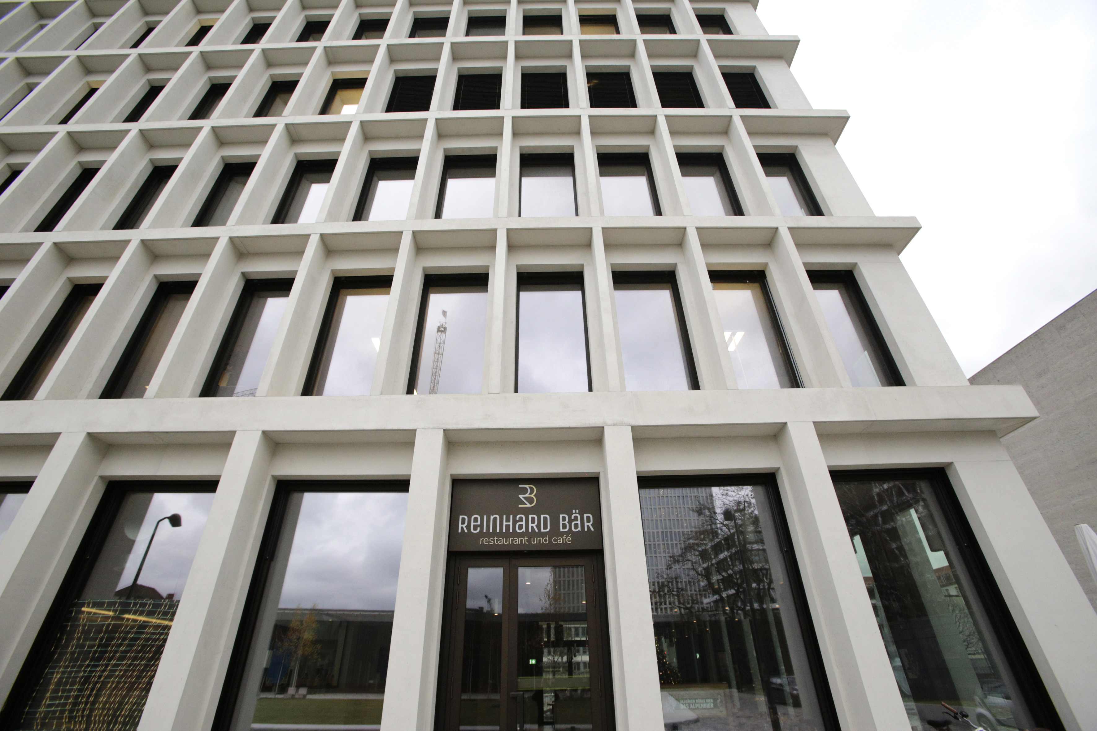 Bauherr des 2016 fertiggestellten Bürogebäudes war das Ingenieur- und Planungsunternehmen EBP, das selbst seinen Standort in das neue Gebäude verlegte. Zusammen mit dem Schweizer Architekturbüro Miller & Maranta entschied sich das Unternehmen für eine zeitlose Architektur in dem aufstrebenden Quartier. Das Geschäftshaus umfasst eine helle Gebäudehülle mit einer selbsttragenden, fugenlosen Sichtbetonfassade. Im Erdgeschoss war Gastronomie vorgesehen – die Räumlichkeiten, die heute das Domizil für Reinhard Bärs neues Restaurant und Café bilden. In dem hellen und hohen Raum mit seinen bodentiefen Fenstern sorgte der Restaurantinhaber passend zur Umgebung für einen kontrastreichen Stil: warmes Holz und kalter Beton, an der Decke zylinderförmige Filzkörper, die eine angenehme Akustik gewährleisten, und glatter, weißer Terrazzo am Boden.