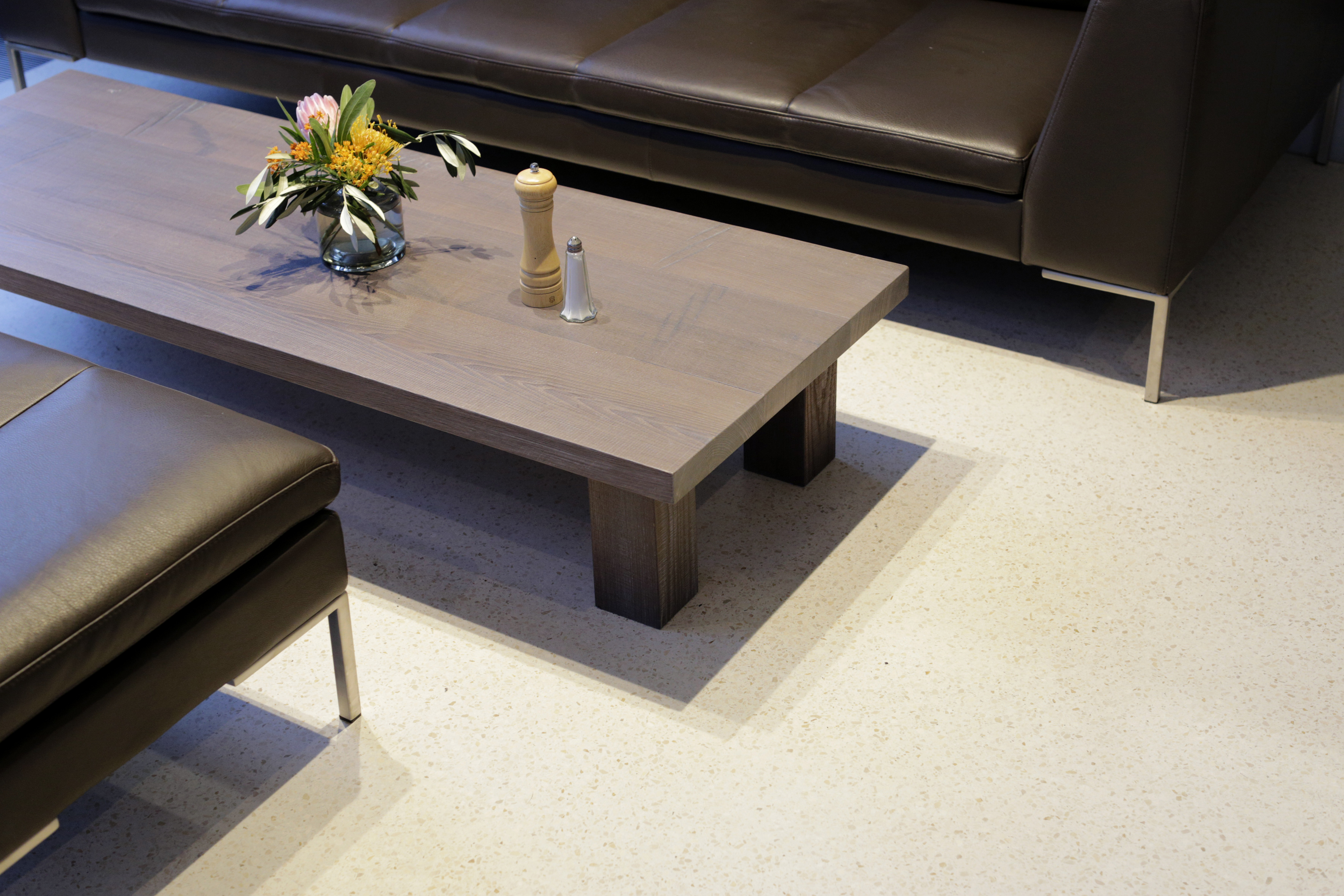 PANDOMO TerrazzoBasic basiert auf traditionellen Terrazzo-Techniken. Dieses Terrazzo-System bietet vielfältige Möglichkeiten zur individuellen und innovativen Oberflächengestaltung für Boden, Wand und Decke. Der Terrazzo-Boden eignet sich besonders für die Herstellung schnell nutzbarer und verlegereifer mineralischer Dekorböden. Durch die Hinzufügung regionaler Zuschlagstoffe lässt sich ein individueller und regionaler Charakter erzielen. Für das Bürogebäude am Hamburger Bahnhof wählten Bauherr und Restaurantbetreiber einen weißen Terrazzoboden mit Natursteinkörnung.