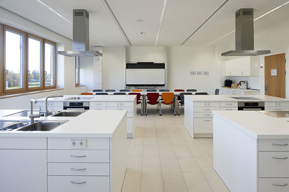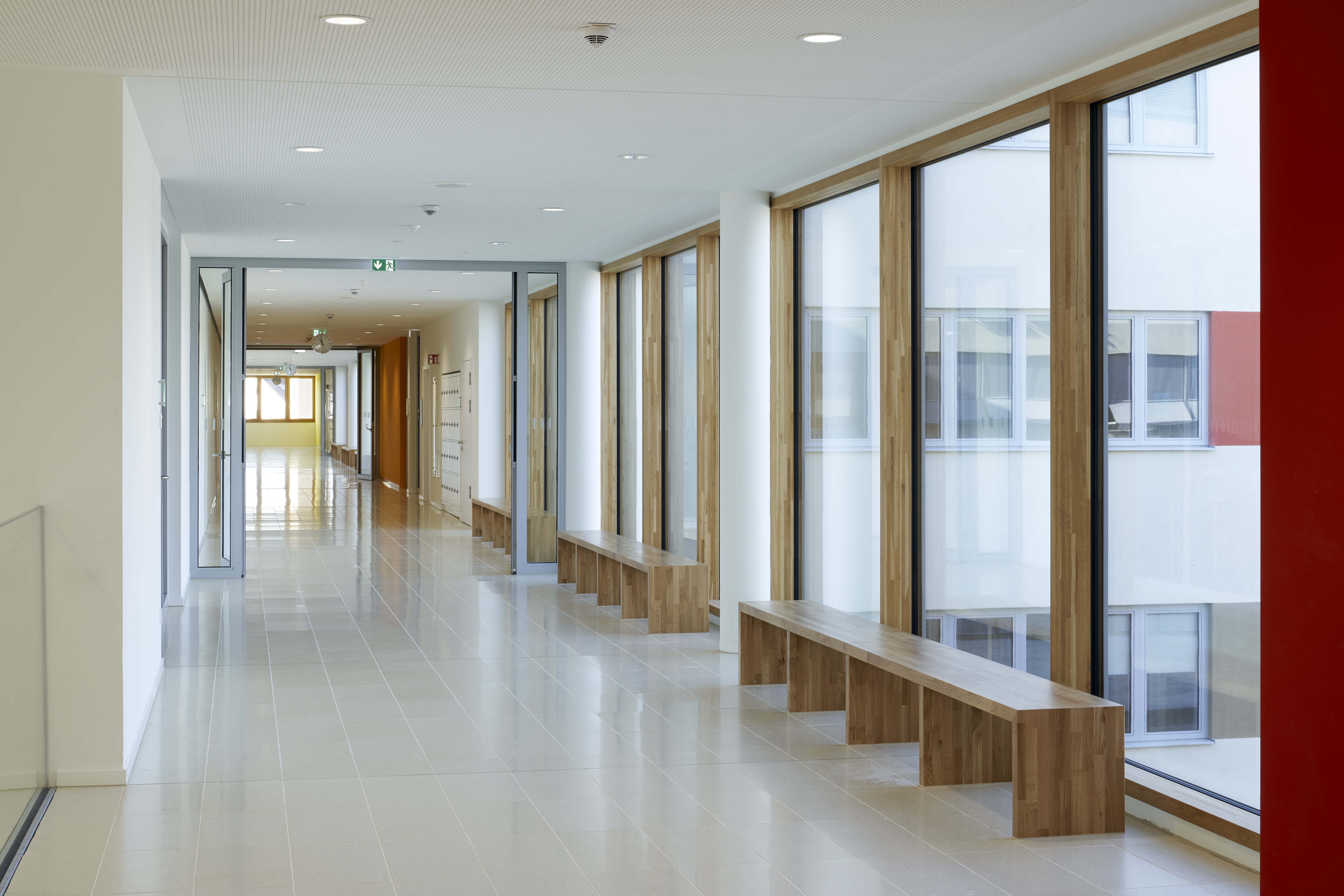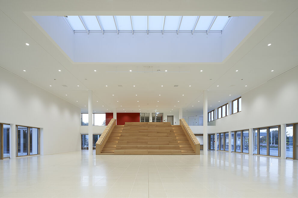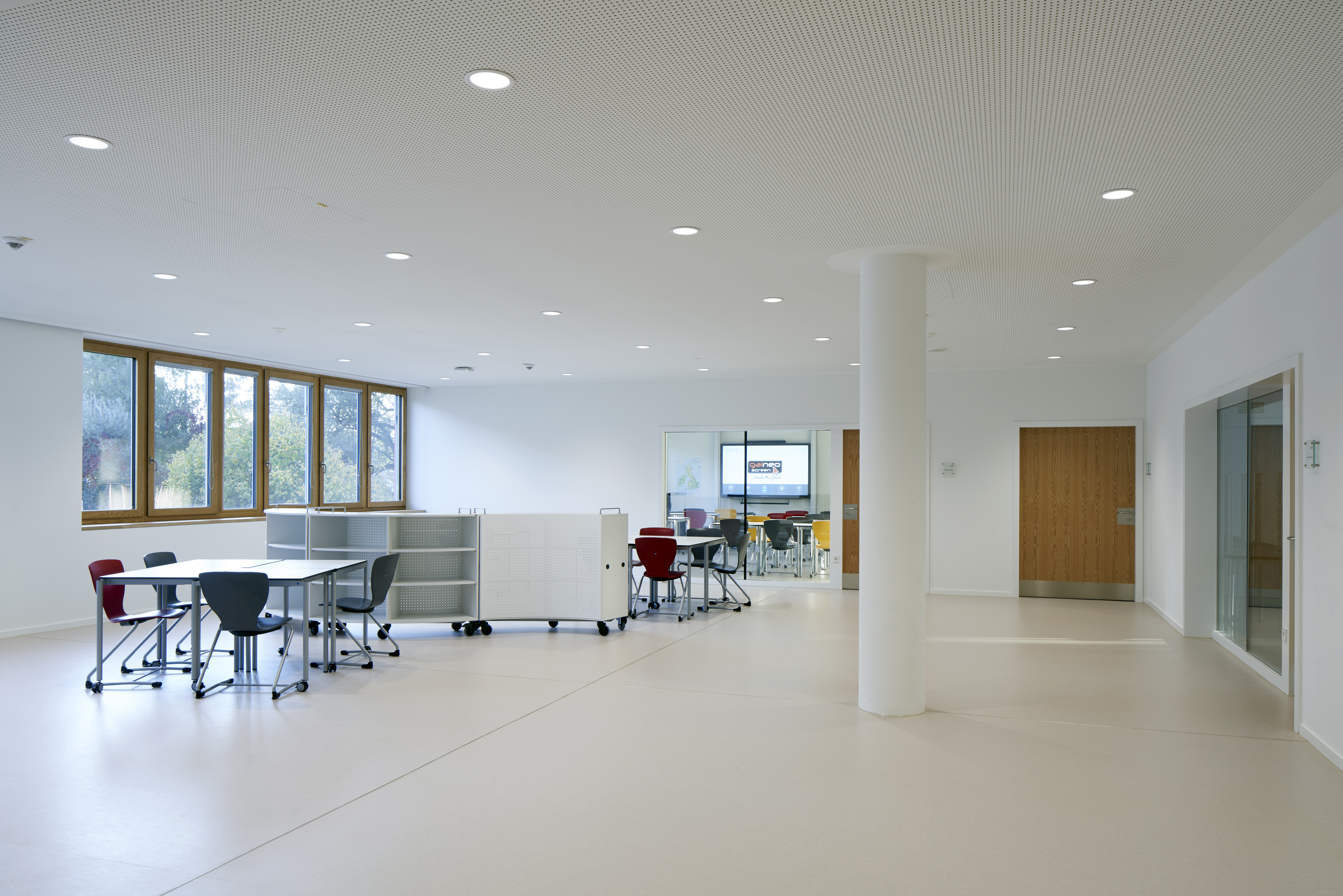 Die Schüler betreten die Schule über die helle und weiträumige Pausenhalle mit einer freistehenden Treppe und Tribüne. Die Halle ist gleichzeitig Treffpunkt für die Schüler, und auch Veranstaltungen finden hier statt. Die neue, durch einen Trennvorhang verbundene Zweifach-Sporthalle lässt sich an die jeweiligen sportlichen Anforderungen anpassen.
