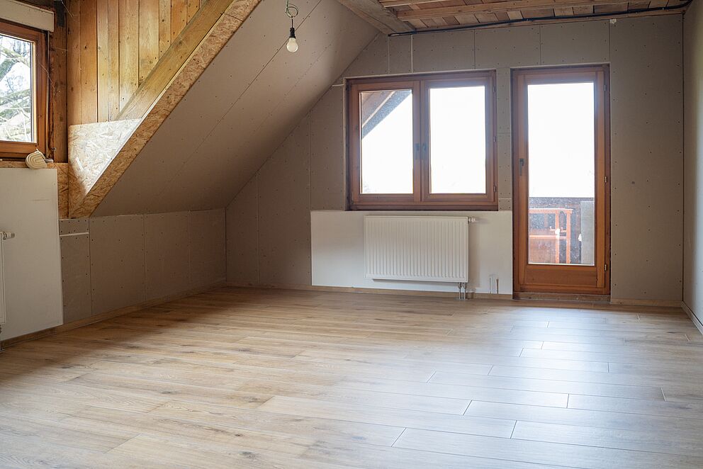 Auf 85 Quadratmetern Grundfläche sollte in dem Haus in Buchenbach eine gemütliche Wohnung mit Wohnküche, Schlafzimmer, Kinderzimmer, Flur und Badezimmer entstehen. Die Höhe des Bodens gab die zum Dachgeschoss führende Holztreppe vor, die nicht verändert werden konnte. Von ihrem Abschluss aus sollte der Boden innerhalb der Wohnung möglichst barrierefrei auf einer Ebene verlegt werden.