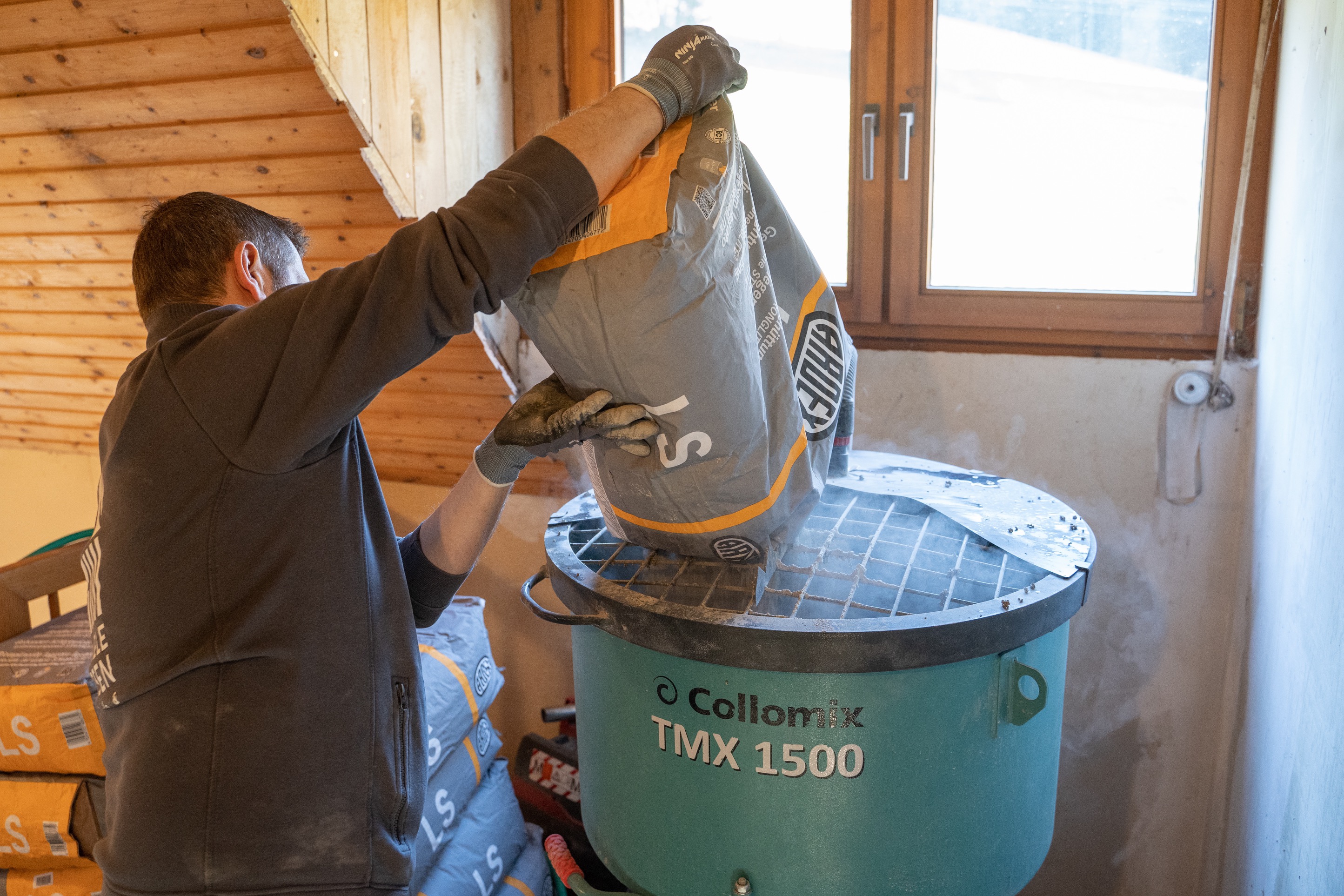 In der neuen Dachgeschosswohnung konnten in dreieinhalb Tagen zwei verschiedene Fliesenbeläge verlegt werden: zwei Räume mit Holzoptik im Format 20 x 120 cm, zwei Räume in Steinbetonoptik im Format 60 x 60 cm. Der Boden war dank des Ardex-Systems in drei Schritten verlegereif. Das Fliesenlegerteam führte zunächst den Einbau der in einem Mischgerät angerührten gebundenen Leichtschüttung ARDEX LS durch. Kleinere Unebenheiten von 2 bis 3 cm im Untergrund konnten sie dabei ebenfalls ausgleichen, verschiedene Zwischenräume zwischen den Holzbalken füllten sie mit der Leichtschüttung aus. „Das war weder für mich noch für das Produkt eine Problematik – das kann das Produkt sehr gut“, findet Verarbeiter Löffler.