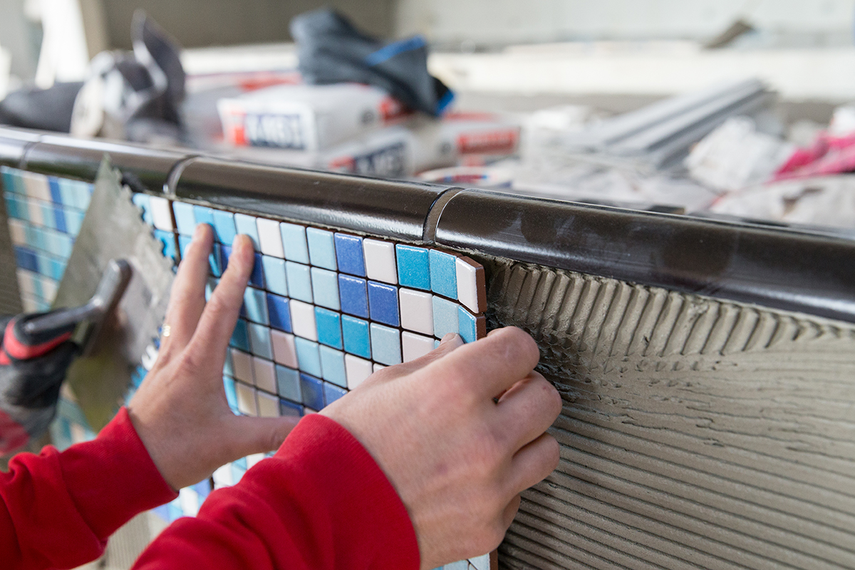 So großartig, wie die Gestaltung der Therme und der Ausblick, so groß waren auch die Herausforderungen an die Fliesenleger. „Wie bei jedem Schwimmbad dreht sich in erster Linie alles um die Dichtigkeit“, erklärt Fliesenlegermeister Christoph Reiser von der Reiser GmbH aus Bad Saulgau. „Das zieht sich von den Becken bis zur Duschanlage durch.“ Dazu kommen die vielen Besonderheiten und Details: Das Solebecken mit dem aggressiven Wasser, das Sportschwimmbecken aus Edelstahl, die Wasserbars und die Fliesen im Format 30 x 60 cm. Nicht zu vergessen die vielen Mosaikfliesen. Die haben wir zum Teil in organischen Formen gelegt.“