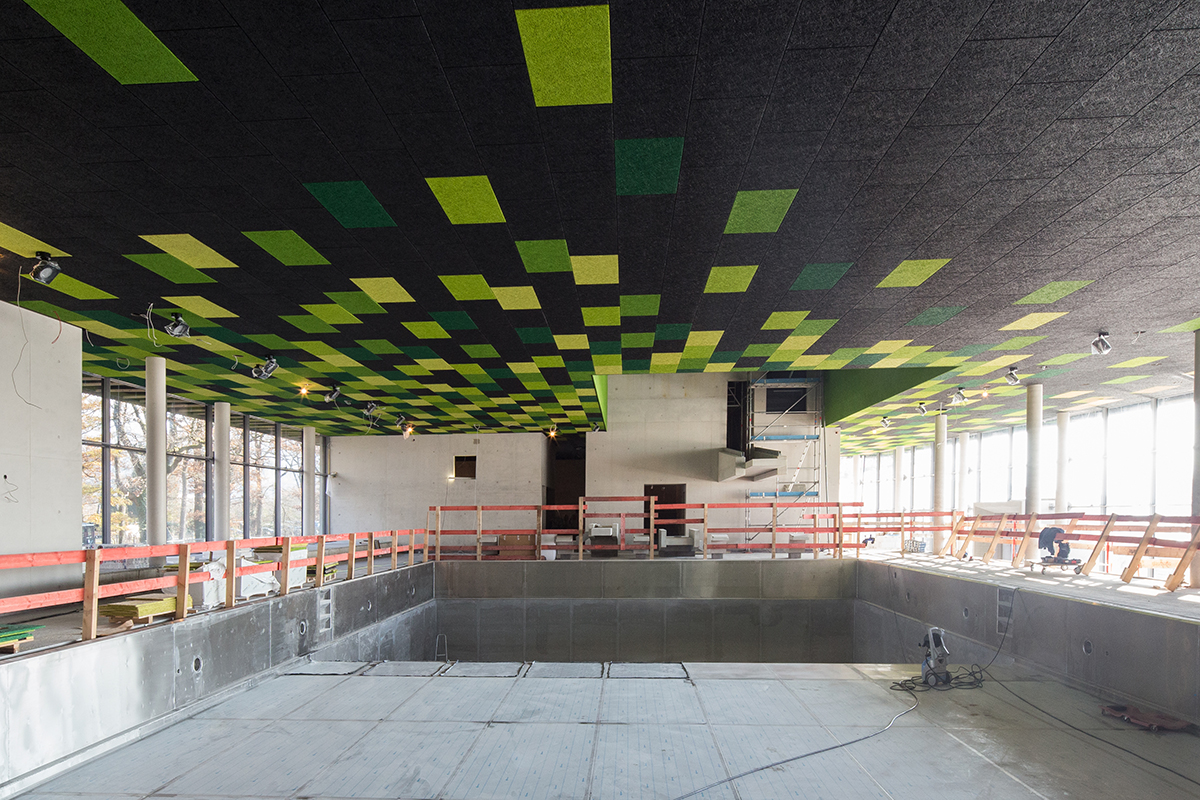 Im Solebecken wie auch in allen anderen Nassbereichen kam der Epoxikleber ARDEX WA zum Einsatz. Er ist besonders geeignet für Bereiche, in denen hohe chemische oder mechanische Belastungen auftreten wie beispielsweise in Schwimm- und Heilbädern. Die Schwallwasserbehälter wurden mit der flexiblen Dichtschlämme ARDEX S7 PLUS abgedichtet. Der Vorteil: Die Konsistenz kann variabel eingestellt werden. So konnte die Verbundabdichtung maschinell an Decken und Wände in den Schwallwasserbehältern gespritzt werden. „Meinen Mitarbeitern war es wichtig, dass sie das Material nicht händisch auftragen brauchen“, so Reiser.