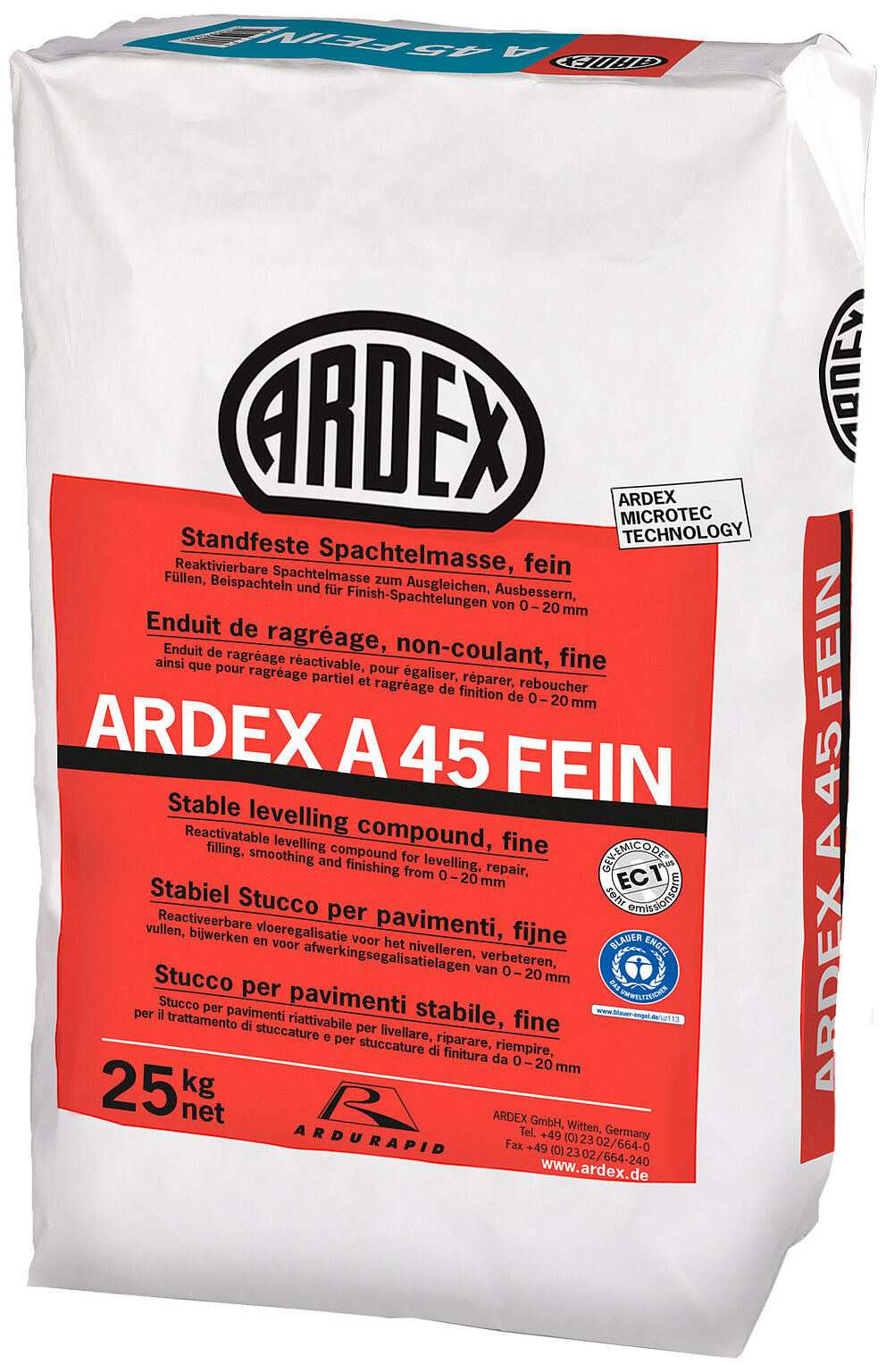 Ebenfalls neu ist die standfeste Spachtelmasse ARDEX A 45 FEIN. „Eine besondere Herausforderung beim Bauen im Bestand ist die Überarbeitung von Altuntergründen – und dafür eignet sich die neue Spachtelmasse hervorragend“, so Ardex-Produktmanager Udo Lorenz. ARDEX A 45 FEIN kann beim Füllen von Löchern, Vertiefungen und Unebenheiten in Estrich und Betonböden eingesetzt werden – und ist beliebig stark auftragbar. „In einem Arbeitsgang sind bis zu 20 mm möglich“, sagt Lorenz. „Zudem lässt sie sich selbst nach 15 Minuten problemlos anarbeiten, ohne dass Übergänge sichtbar sind.“ Aber auch die andere Richtung ist möglich: Die sehr emissionsarme Spachtelmasse lässt sich bis auf Null ausziehen – das ermöglicht perfekte Übergänge.