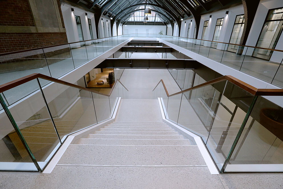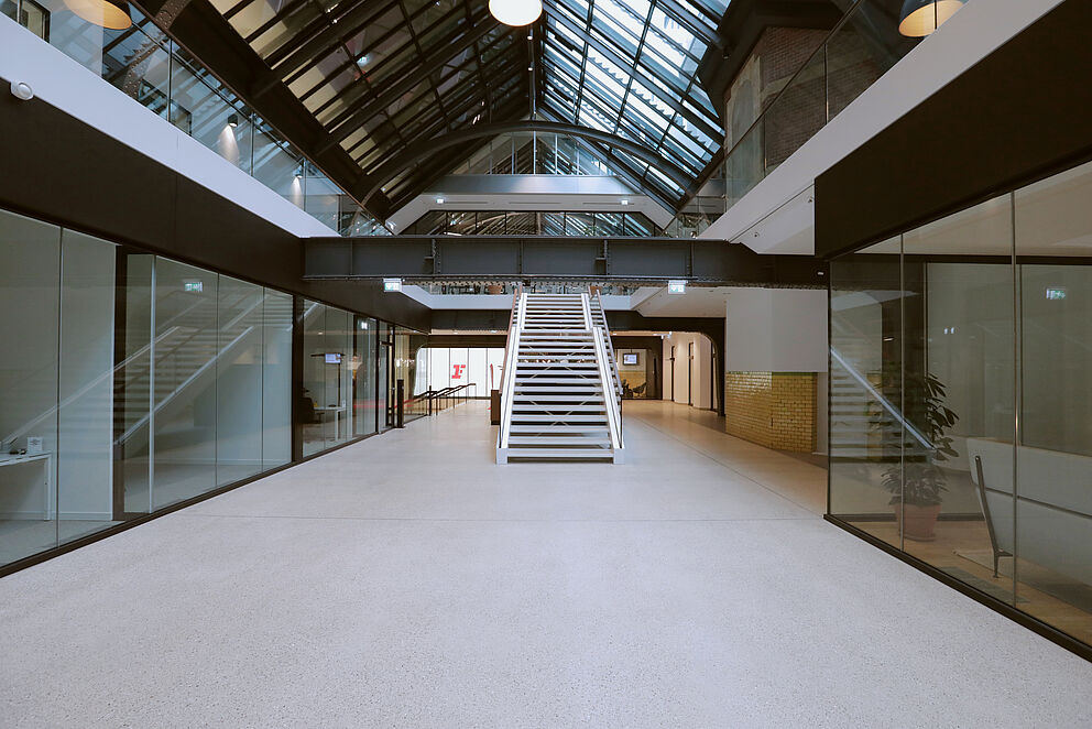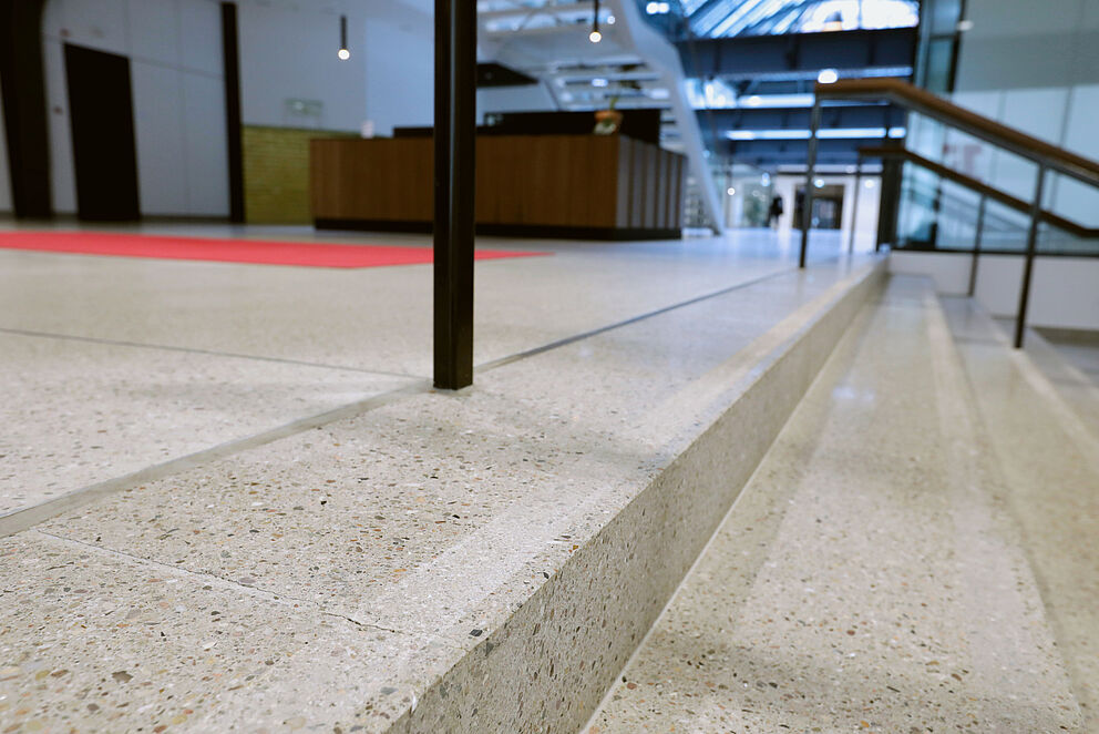 Die große Eingangshalle mit Galerie, die Treppenhäuser und die WC-Anlagen wurden mit Pandomo-Terrazzo gestaltet. Insgesamt galt es, den Terrazzoboden auf einer Fläche von 1.600 Quadratmetern und 300 Winkelstufen aufzubringen. Die Herausforderung: Der Zeitplan sah vor, dass die Arbeiten nacheinander in teilweise kleinen Abschnitten von 20 bis 60 Quadratmetern durchgeführt werden. Trotzdem sollte eine gleichmäßige Oberflächenoptik entstehen.