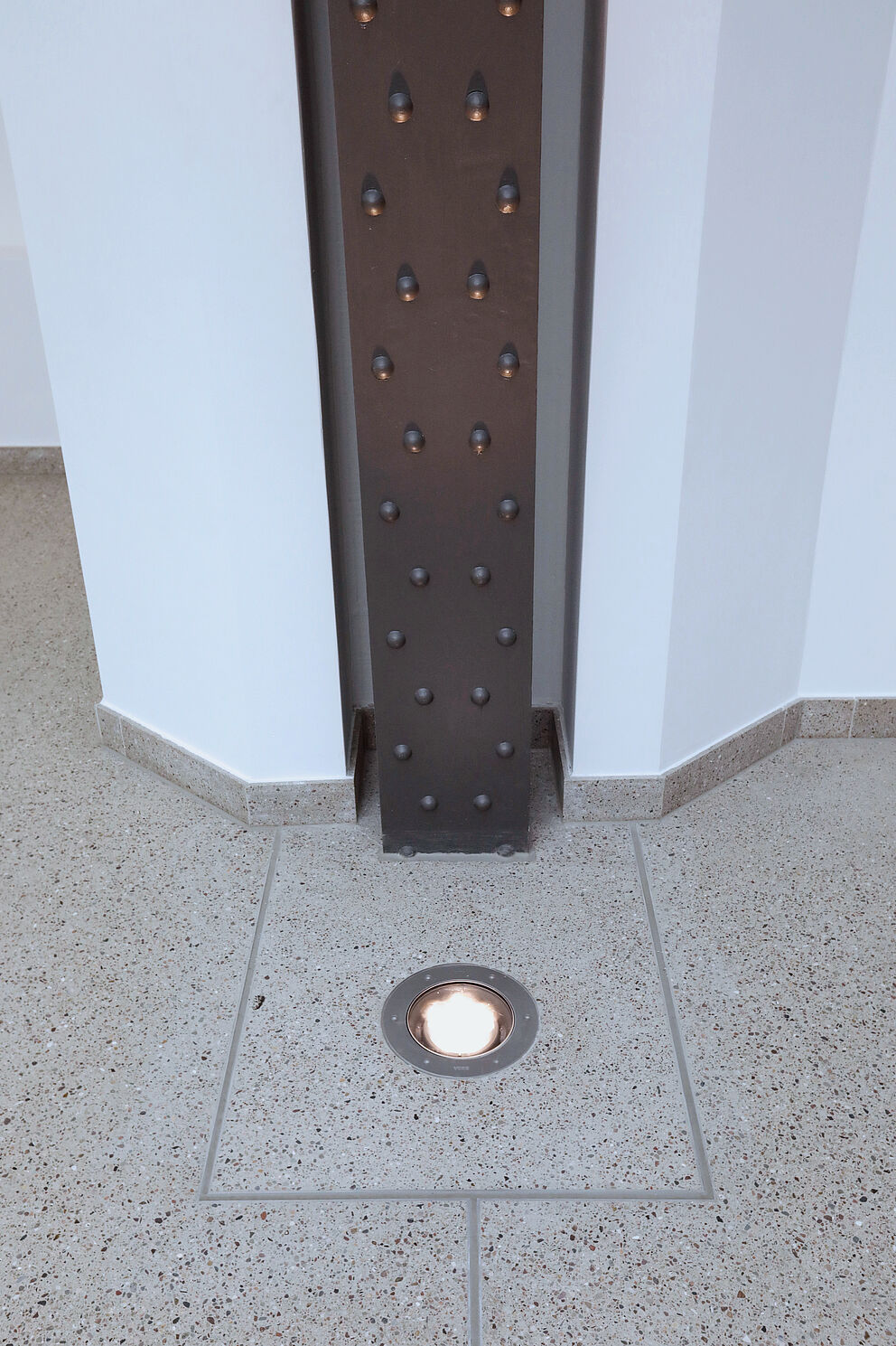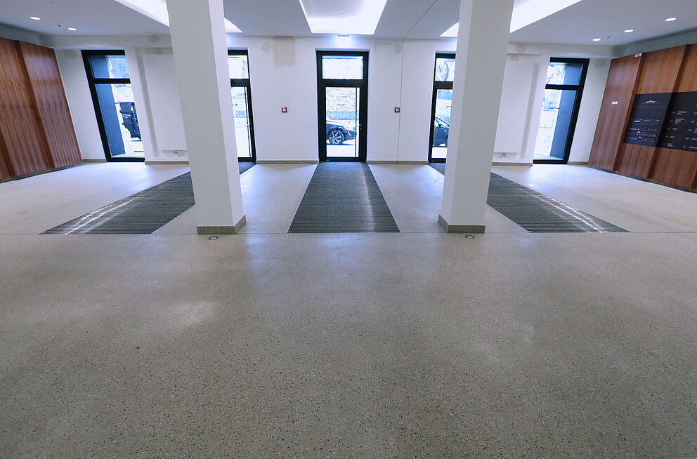 Für das WLC wählte der Bauherr einen grauen Terrazzoboden mit regionaler Natursteinkörnung. Die vergleichsweise schnelle und einfache Verarbeitung des Materials ist ein großer Vorteil: Auf den Aufbau aus Noppenplatten, mineralischem Magermörtel oder mineralischer Haftschlämme, Gleitlager und Trittschalldämmung wurde die erste Estrichschicht aufgetragen. Darauf brachten die Handwerker die Haftgrundierung auf Epoxybasis auf. In dieser Haftgrundierung wurde frisch in frisch die Vorsatzschicht des Estrichterrazzos aufgetragen. Dabei konnten die ersten Schichten maschinell gepumpt werden. Die folgende Schicht wurde mit einem Zwangsmischer hergestellt. Nach dem Abbinden der Vorsatzschicht wurde der Boden in mehreren Arbeitsgängen bis zum Feinschliff geschliffen und imprägniert.
