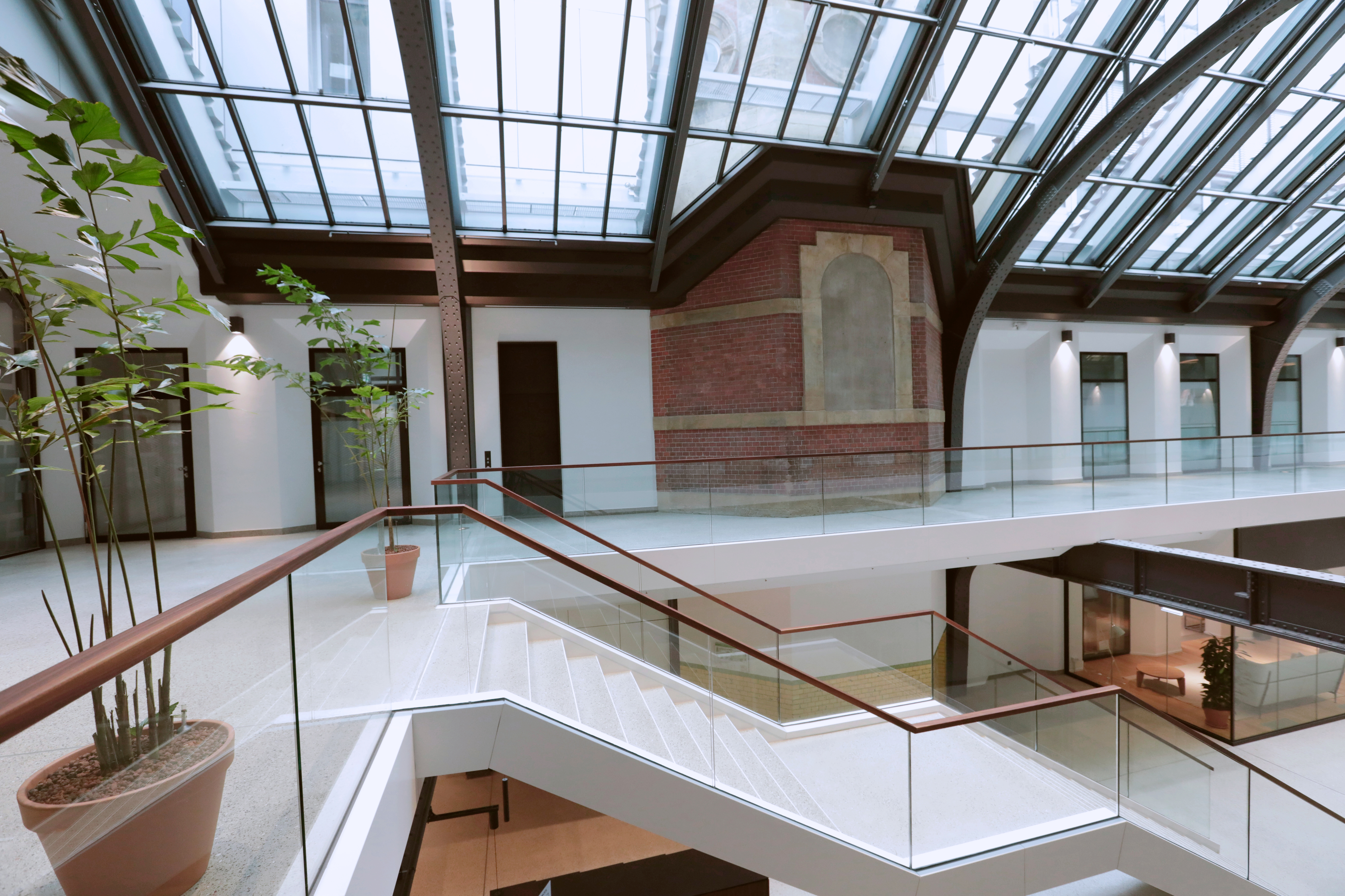 Die denkmalgeschützte Fassade erhalten, das Innere komplett neugestaltet: So wurde der Alten Oberpostdirektion neues Leben eingehaucht. Die Fassade des Wilhelminischen Prachtbaus von 1883 blieb beim Umbau stehen. Im Mittelbau und der historischen Mittelhalle sind auf sieben Stockwerken Flächen für ein Fitness-Studio, ein Coworking-Space und weitere moderne Büro- und Geschäftsräume entstanden. Die alten Strukturen blieben bestehen, und selbst die Fenster wurden nach der Reinigung wieder eingesetzt – der Charakter des historischen Gebäudes sollte gewahrt bleiben. So wurden auch für den Neuaufbau der zentralen Glashalle die denkmalgeschützten genieteten Stahlträger zurückgebaut, aufgearbeitet und wieder eingebaut.