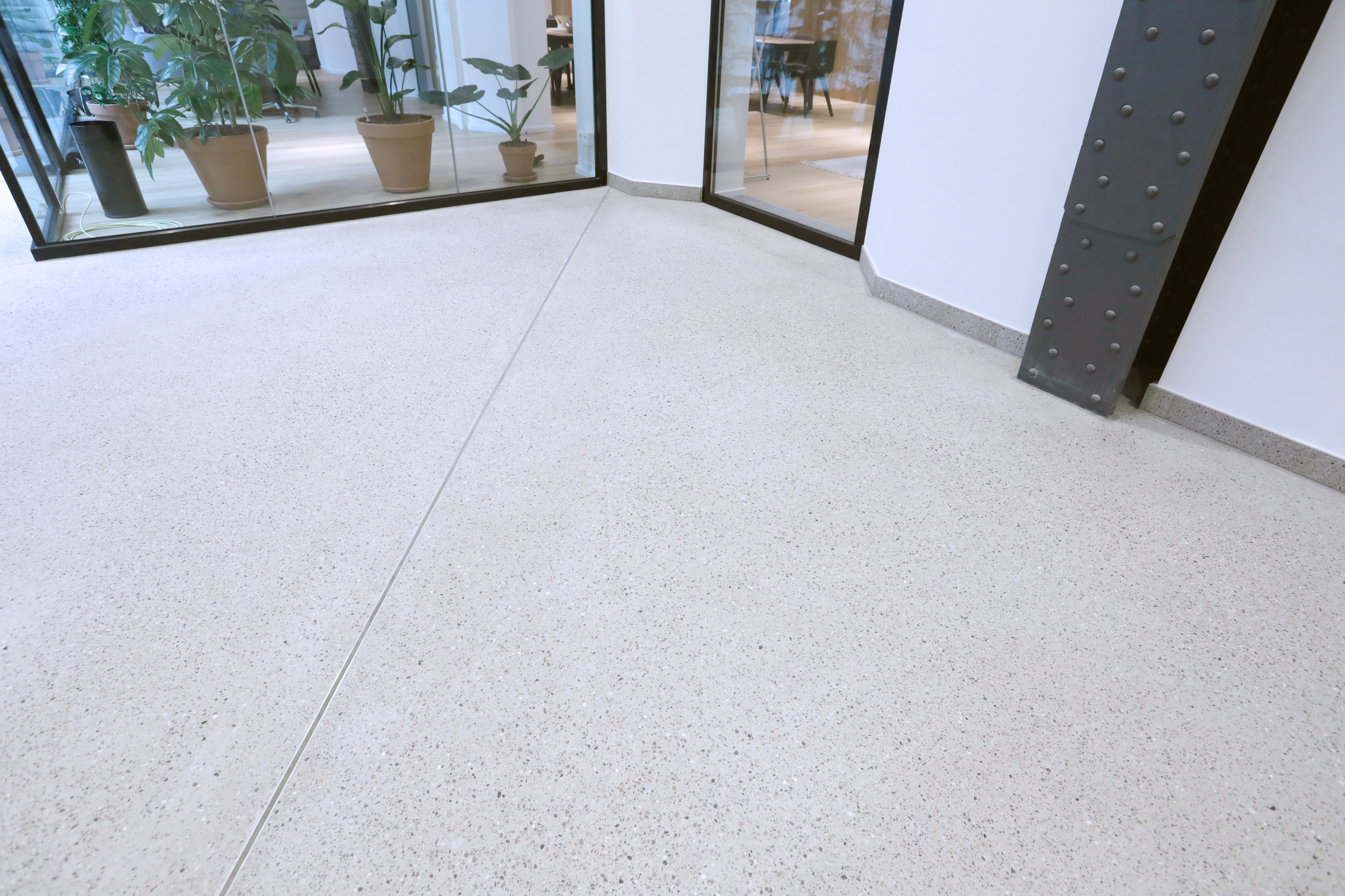 Für die saubere Ausführung hat der Boden-Spezialist PANDOMO TerrazzoBasic und die graue Bindemittelmatrix PANDOMO BG eingesetzt. Mit diesem Bindemittel lassen sich mineralische, schnell nutzbare Dekorböden in Terrazzo-Optik herstellen – im Verbund, auf Trennschicht und auf Dämmung.