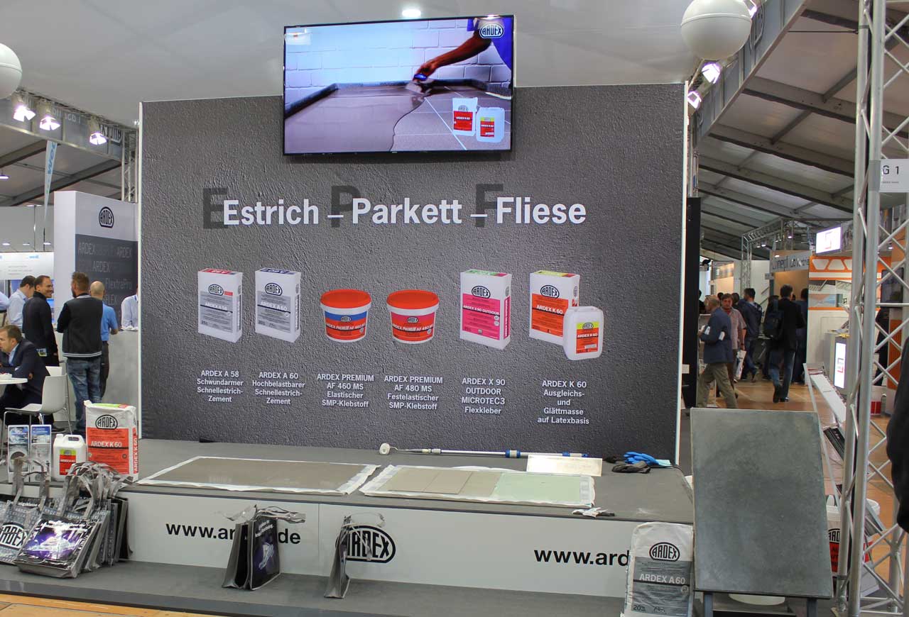 Wie können Verarbeiter bei der Estrichverlegung Zeit sparen, ohne Abstriche bei der Qualität zu machen? Mit den richtigen Produkten: Die beiden Ardex-Schnellestriche trocknen schnell und härten schnell aus. Nach nur einem Tag sind der schwundarme Schnellestrich-Zement ARDEX A 58 und der hochbelastbare Schnellestrich-Zement ARDEX A 60 verlegereif für Fliesen, Naturwerkstein und Betonwerkstein. Elastische und textile Beläge sowie Parkett können nach nur vier Tagen verlegt werden. Der A 60 ist auch optimal als Nutzestrich einsetzbar. Dies stieß bei den Fachbesuchern auf großes Interesse.