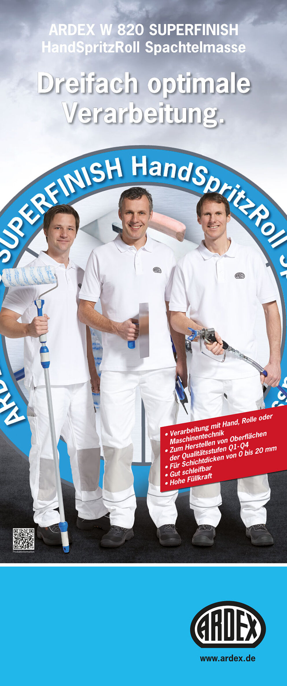 Ein planebener Untergrund ist ein absolutes Muss bei jeder Wand- und Deckenspachtelung. Mit der seit Jahren bewährten, spritzbaren Wandspachtelmasse ARDEX W 820 SUPERFINISH lassen sich selbst große Schichtdicken von bis zu 20 mm schnell, rationell und bequem in nur einem Arbeitsgang aufziehen. Und dies jetzt quasi „dreifach optimal“: Je nach Wunsch und Anwendungssituation kann die gipsbasierte Wandspachtelmasse entweder manuell per Handspachtel oder einfach mit der Rolle, aber auch maschinell bequem im Spritzverfahren mit allen gängigen Misch- und Förderpumpen verarbeitet werden. Neu dabei ist die einfache und angenehme Verarbeitungsmöglichkeit jetzt auch mit der Rolle. Diese erste gipsbasierte Rollspachtelmasse am Markt ist besonders unkompliziert. Sie ermöglicht ein gleichmäßiges Auftragen des Materials mit allen handelsüblichen Rollen. Damit lassen sich auch große Flächen mühelos bewältigen. Im Ergebnis entstehen Top-Oberflächen in den Qualitätsstufen Q1 bis Q4.