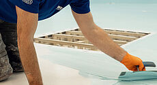 Danach begann der Aufbau des „neuen“ Beckens. Im ersten Schritt haben die Fliesenspezialisten die rohen Wände mit ARDEX AM 100 verputzt und den Boden mit ARDEX A 46 ausgeglichen. Der Ausgleichsmörtel und die standfeste Spachtelmasse wurden speziell für strapaziöse Außeneinsätze entwickelt – und konnten wie geplant nach dem schnellen Erhärten für die Aufnahme der Abdichtung vorbereitet werden. Hier kam die 2-komponentige Epoxigrundierung ARDEX EP 500 zum Einsatz. Diese Grundierung ist ohne Absanden einsetzbar und sperrt gegen kapillar aufsteigende Feuchte ab. Zudem lässt sie sich schnell und einfach verarbeiten – je nach Bedarf mit Rolle, Pinsel oder Spachtel.
