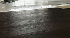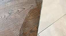 Der Eingangsbereich des Kinos empfängt die Besucher mit einer Fliesenfläche. Daran angrenzend wurde ein Vinyl-Designboden von Amtico in Holzoptik verlegt. Dafür haben die Bodenleger den Spezialkleber für elastische Beläge ARDEX AF 155 verwendet. „Dank der langen Einlegezeit konnten wir den Belag in der Halbnassphase verkleben“, erklärt Jan Loosen von Bock Interfloor. „Das ging komplett blasenfrei.“