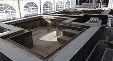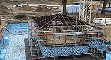 Handwerkskunst war auch für die beiden Warmwasserbecken auf dem Dach der Wellnessoase gefragt. Hier können die Besucher die Seele baumeln lassen, die Natur genießen und sicher sein, in einem ästhetisch anspruchsvollen und fachlich hervorragend erstellten Becken zu entspannen. „Die Becken mussten sicher abgedichtet werden“, erklärt Ardex-Gebietsleiter Detlef Hinkelmann, der die Bauarbeiten fachlich begleitet hat. Zum Einsatz kam daher die Tricom Dichtbahn ARDEX SK 100 W, die unter anderem speziell für den Schwimmbadbau entwickelt wurde. Die Vorteile: Sie ist wasserdicht, rissüberbrückend und gewährleistet eine gleichmäßige Schichtdicke.