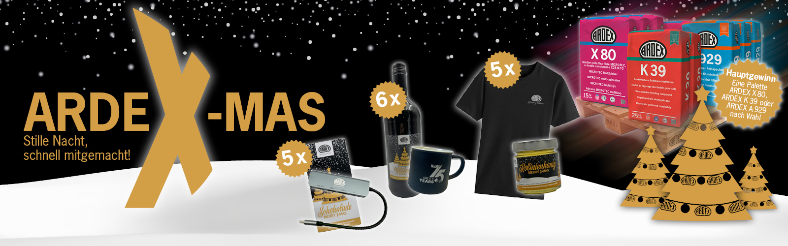 Unser großes ARDEXMAS Adventsgewinnspiel versüßt dir die Wochen bis Weihnachten mit der Chance auf großartige Preise. Jede Woche gibt es etwas Neues zu gewinnen – und am Ende wartet der Hauptpreis auf dich!