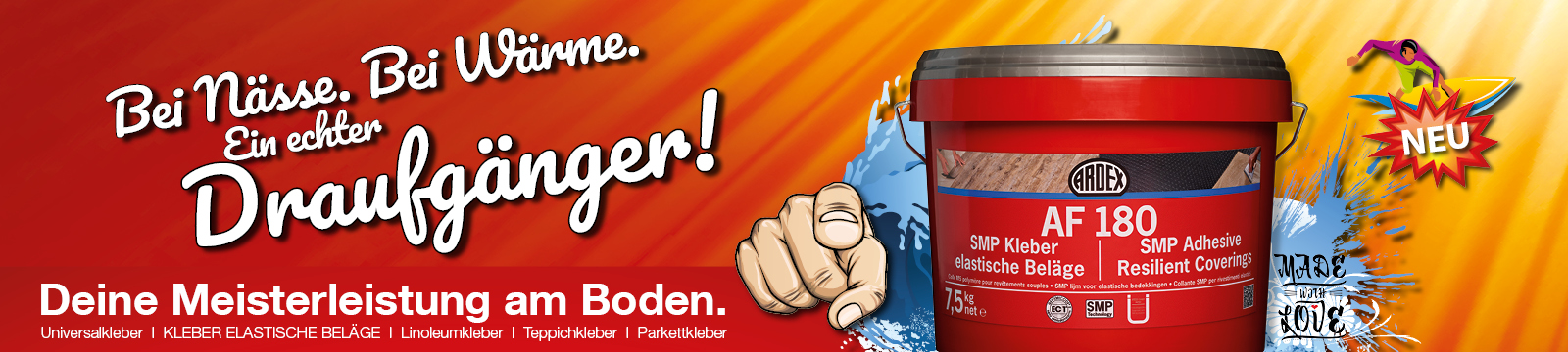 ARDEX AF 180 ist der Kleber für hochbelastbare Bereiche, zum Beispiel bei hoher Wärmeeinwirkung, starken mechanischen Belastungen oder erhöhtem Feuchtigkeitsaufkommen. Der SMP-Klebstoff ist wasserfrei und löst sich durch Feuchtigkeit nicht an. Zudem verfügt er über eine hohe Klebkraft und harte, starre Klebstoffriefe. Deshalb ist er in Bädern ebenso gut einsetzbar wie in Wintergärten, bei bodentiefen Fenstern oder in Eingangsbereichen von Einkaufszentren, Flughäfen oder Krankenhäusern.