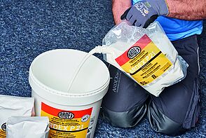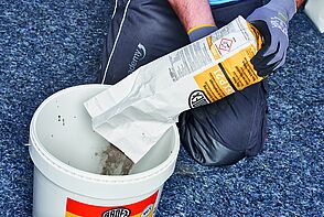 Pulver- und Flüssigkomponente aus dem Eimer nehmen