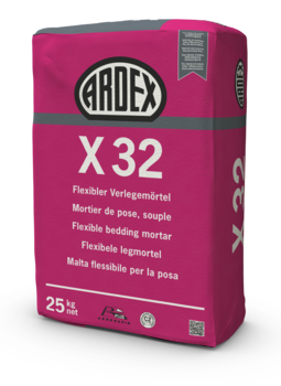 ARDEX X 32 ist ein flexibler Verlegemörtel zur verfärbungs- und ausblühungsfreie VerIegung von Naturwerksteinplatten, Natursteinfliesen, Betonwerksteinplatten und Cottoplatten. Ausgestattet mit ARDURAPID PLUS Effekt kann X 32 im Innen- und Außenbereich eingesetzt werden. Die Verlegung kann im Dünn-, Mittel- und Dickbettverfahren erfolgen. ARDEX X 32 erfüllt die Anforderungen C2 FTE S1 nach EN 12004 / 12002.