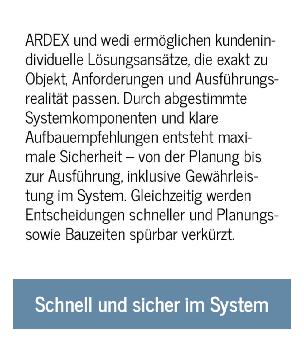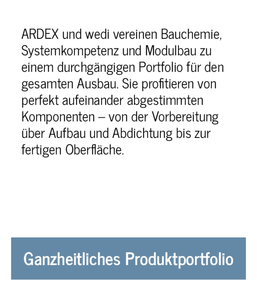ARDEX und wedi sind Ihre Partner für ganzheitliche Systemlösungen im Innenausbau. Gemeinsam bieten wir abgestimmte Lösungen über alle relevanten Verarbeitungsschritte hinweg – vom Systemaufbau und der Untergrundvorbereitung über Abdichtung, Kleben und Spachteln bis zur fertigen Oberfläche. Unser breites Sortiment deckt zentrale Gewerke und Schnittstellen ab, vom Rohbau über Estrich und Ausgleich bis zur Verlegung: ARDEX liefert die passende Bauchemie, wedi die modularen Bausysteme – gemeinsam ergeben sie individuelle Komplettlösungen von der Untergrundvorbereitung über Abdichtung und Verklebung bis zu Duschelementen und Designoberflächen.