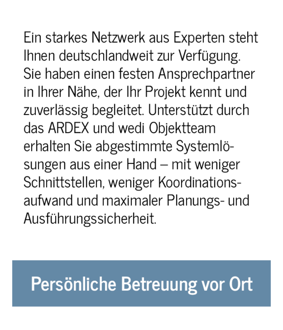 Dabei geht unser Leistungsversprechen deutlich über den reinen Produktverkauf hinaus: technische Expertise, praxisnahe Beratung und persönliche Projektbetreuung stehen im Mittelpunkt. Gemeinsam mit Ihnen entwickeln wir kundenindividuelle Lösungsansätze, die zu Objekt, Terminplan, Aufbauhöhen, Nutzung, Anforderungen und Ausführungsrealität passen – mit dem Ziel, dass die Lösung nicht nur „auf dem Papier“, sondern auf der Baustelle funktioniert. Unser Expertenteam ist deutschlandweit aufgestellt und stellt sicher, dass Sie jederzeit einen Ansprechpartner in Ihrer Nähe haben, der Ihr Bauprojekt kennt und zuverlässig begleitet. Das ARDEX x wedi Objektteam unterstützt zusätzlich mit gebündelter Systemkompetenz und sorgt für klare Abstimmung – von der Planung bis zur Ausführung.